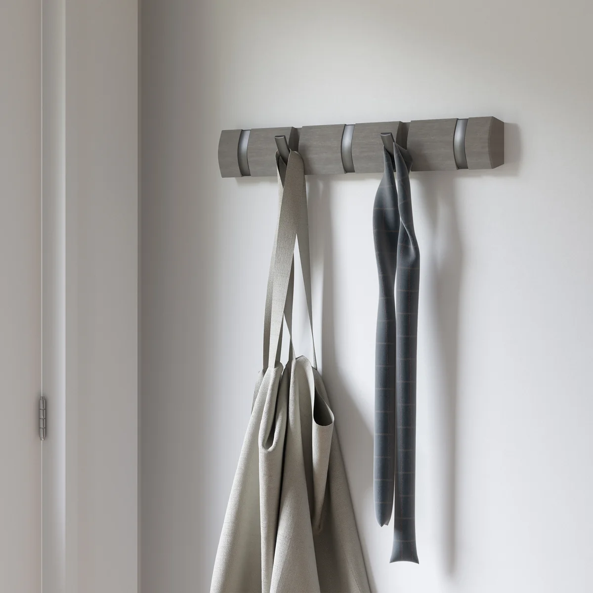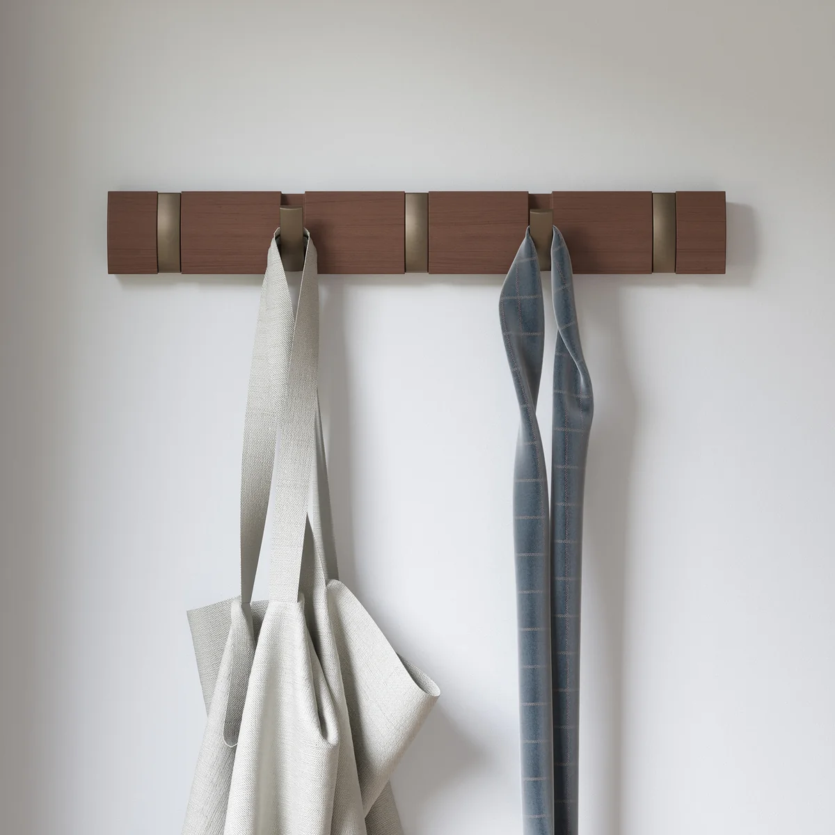 Ersetzen Sie Ihre Kleiderbügel und -haken durch die stilvolle Flip Garderobe! Attraktiv, stivoll und praktisch! Die Flip Hook 5er Garderobenleiste von Umbra lässt sich schnell und einfach an jede Wand montieren und ist sofort einsatzbereit. Die Flip Garderobe besteht aus lackiertem Hartholz und fünf nickelbeschichteten Haken.