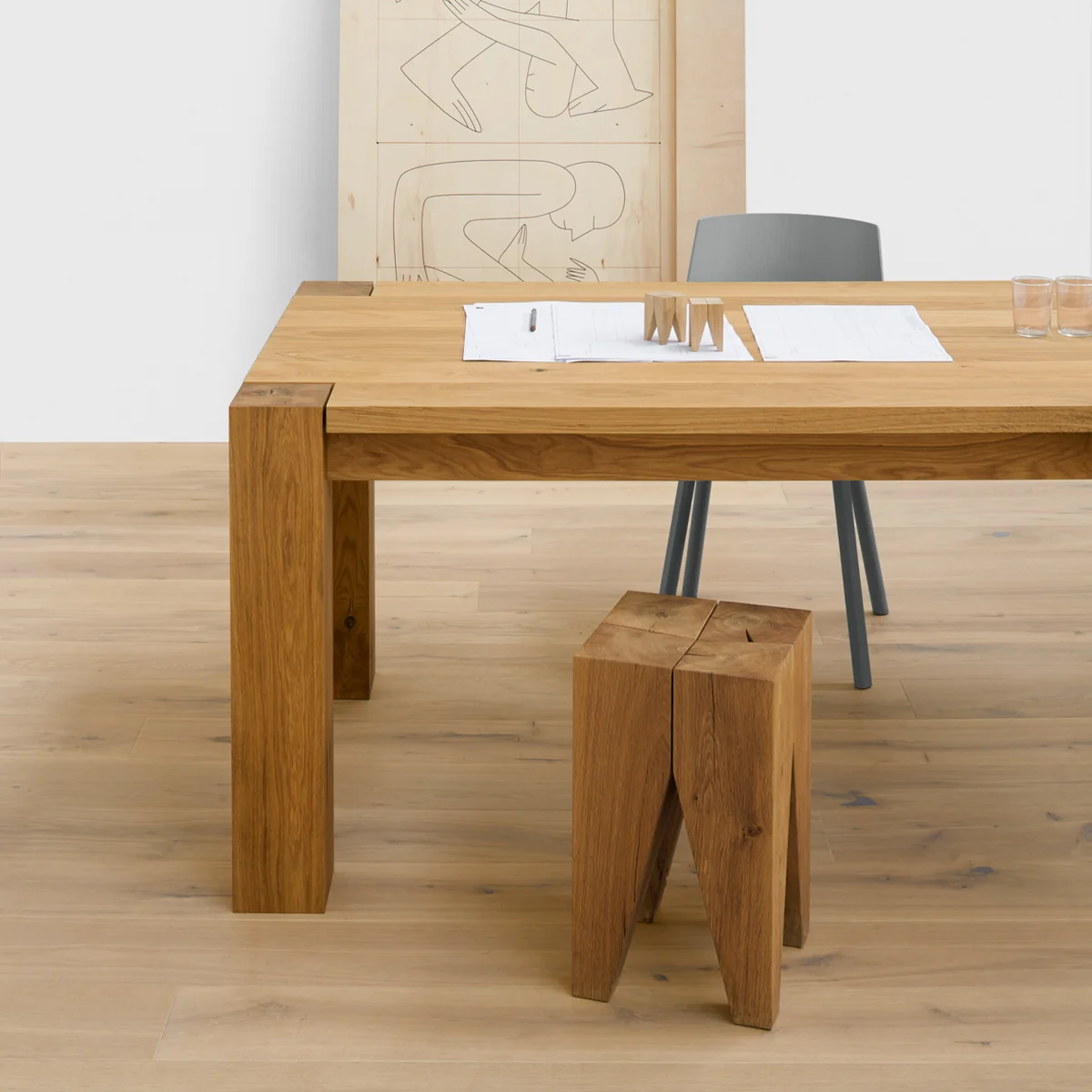 Die zurückhaltende Form des Backenzahn Hockers unterstreicht die einzigartige Materialqualität. Denn aus geöltem Holz gefertigt ist jeder Hocker ein Unikat. „Wir nehmen das Holz, wie es in seiner Schönheit kommt“ so das Motto von e15, wo der Hocker, der inzwischen Klassiker-Status erreicht hat, seit 1996 produziert wird.
