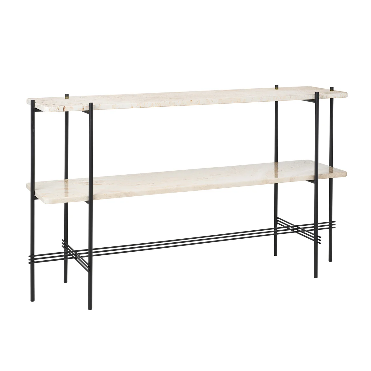 Die Travertine Kommode von Gubi ist eine skulpturale Kommode, die vom Design auf dem Travertine Couchtisch basiert. Wie sein Vorbild, zieht sie ihre Energie aus Kontrasten: Schlanke Metallrahmen treffen auf die stabilen Fächer aus wunderschönem Travertinstein. Entworfen wurde sievom Designer-Duo GamFratesi für das Restaurant "The Standard" in Kopenhagen. Mit ihrem skulpturalen Aussehen und dem edlen Material passt die Kommode perfekt ins Ambiente und eignet sich als Regal, Kommode, zum Lagern, Präsentieren und Verstauen.