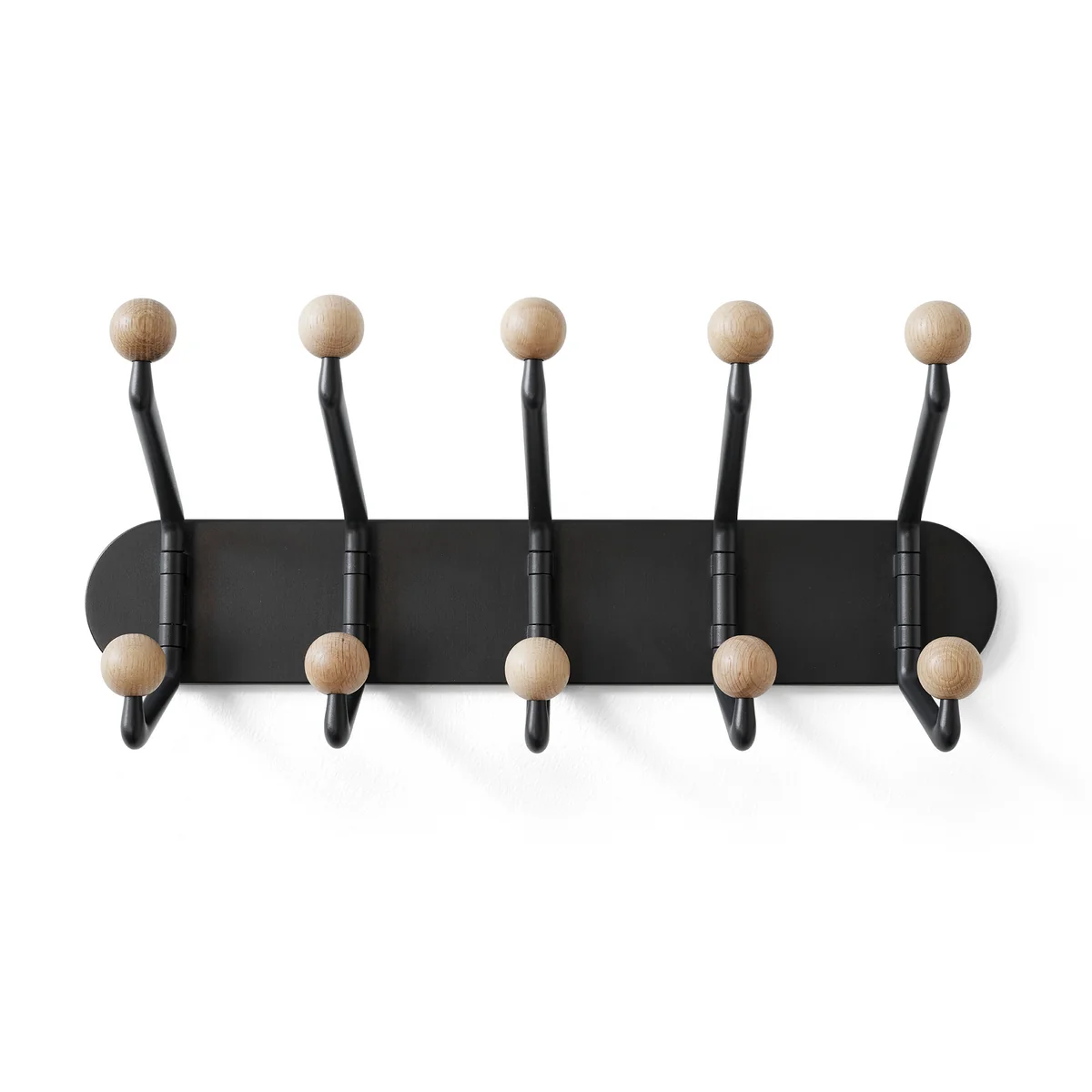 Die Metallteile der Capture Wandgarderobe werden aus Aluminium gegossen, dann gefräst und anschließend pulverbeschichtet. Die Holzornamente sind aus Massivholz gedrechselt.