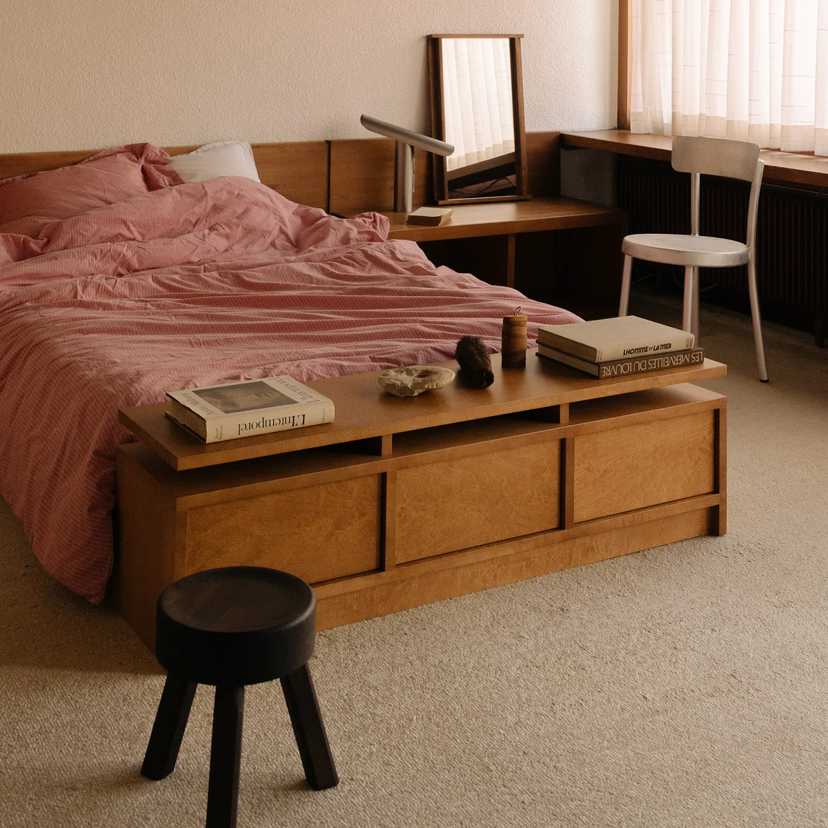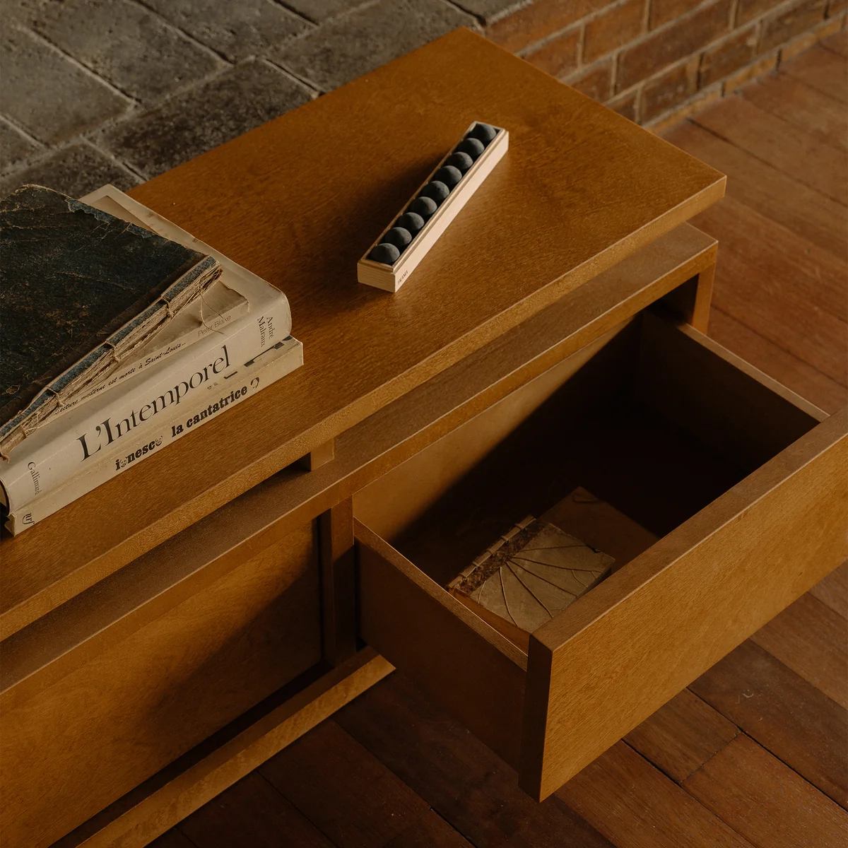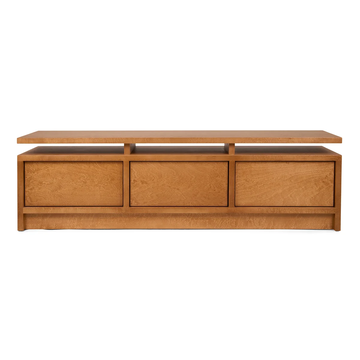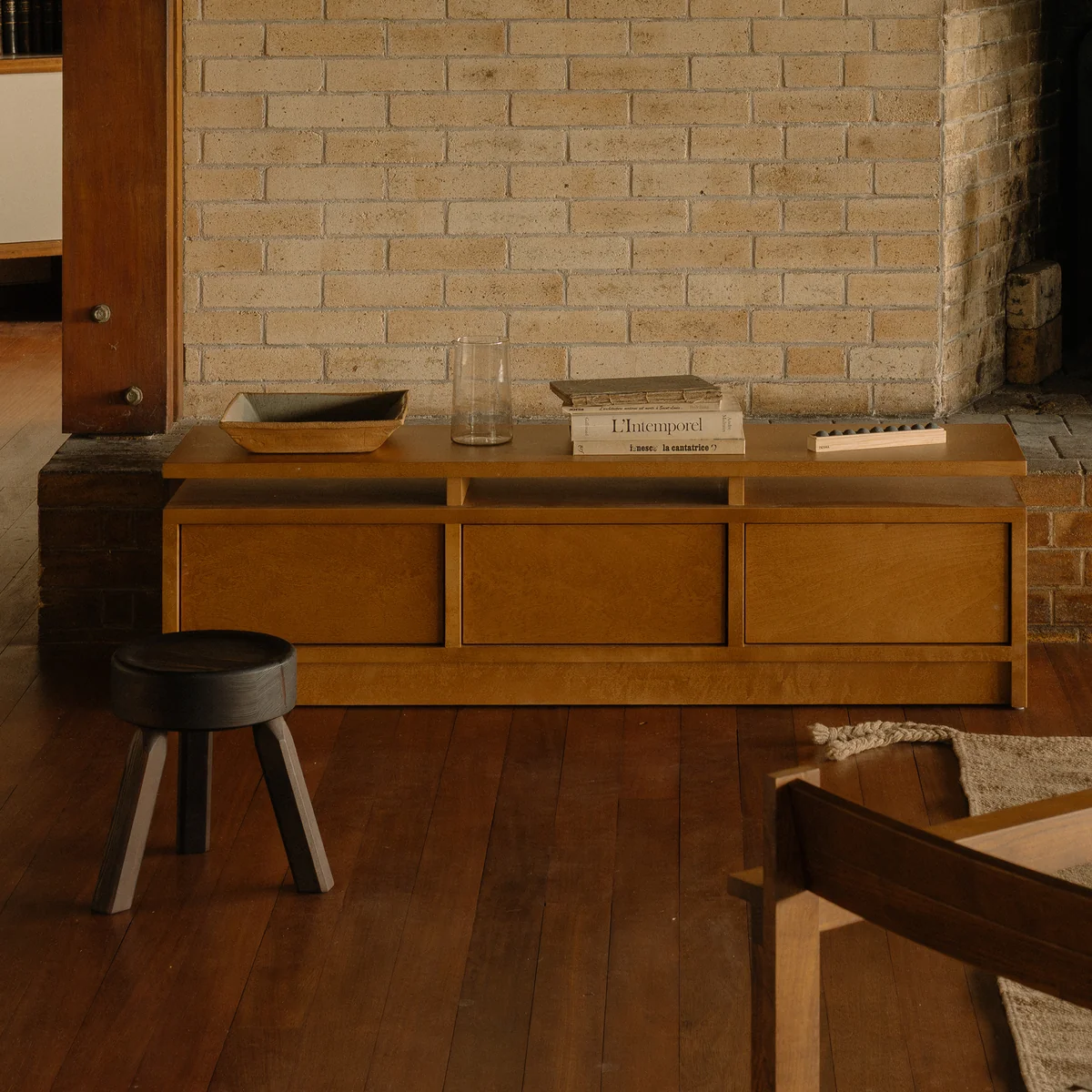 Das Ratio Lowboard vereint großzügigen Stauraum mit einem schwebend wirkenden Design. Gefertigt aus MDF, Birkenfurnier und Massivbirke in einem warmen Braunton, besticht es durch seine feine Holzmaserung und hochwertige Verarbeitung. Drei push-to-open Schubladen auf leisen Soft-Close-Schienen bieten reichlich Platz für Alltagsgegenstände, während das offene, verborgene Fach auf der Oberseite der Konsole subtile Leichtigkeit verleiht. Mit seiner klaren, ausgewogenen Form fügt sich das Ratio Lowboard harmonisch in moderne wie klassische Interieurs ein.