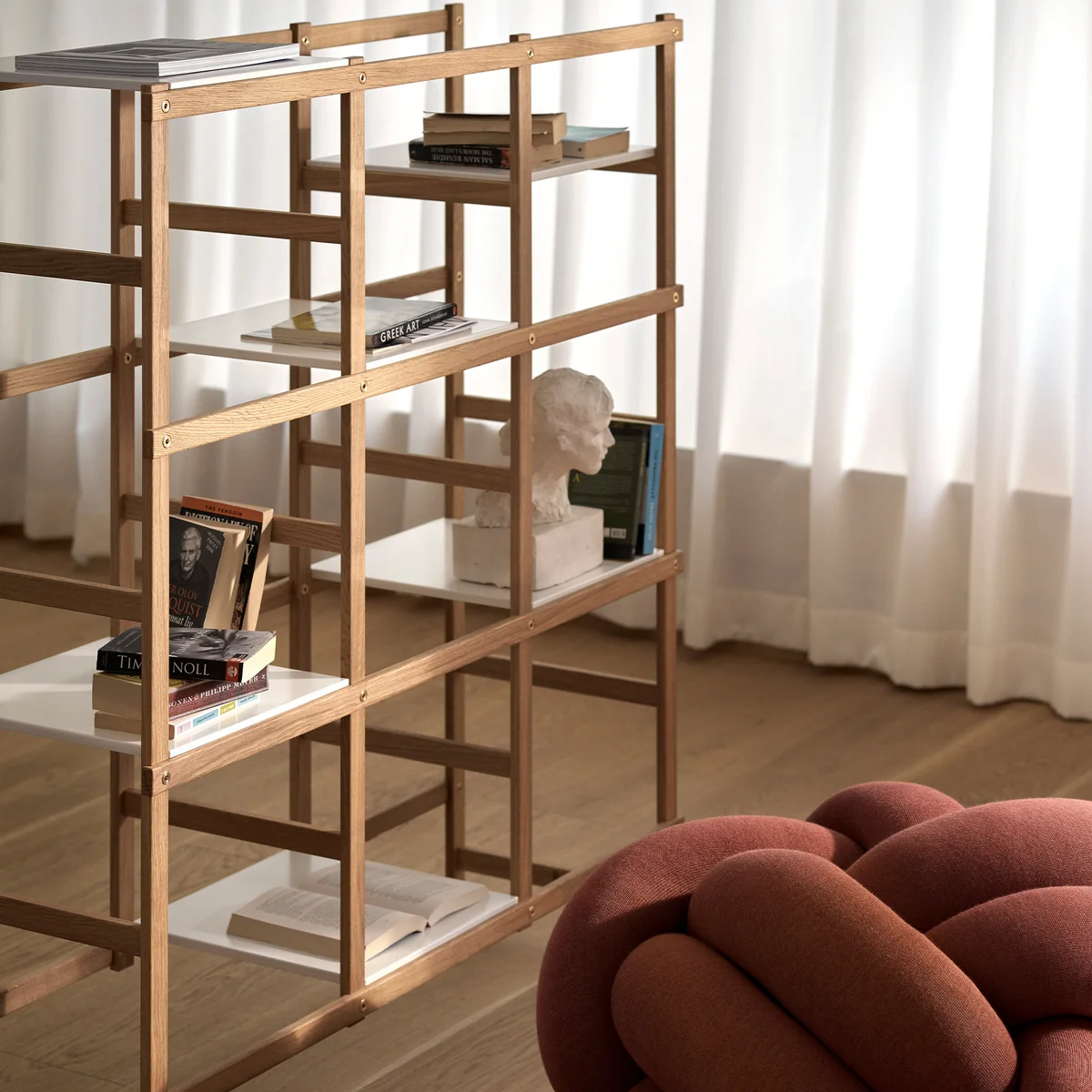 Das Frame Möbelsystem ist in unterschiedlichen Größen erhältlich und wird aus skandinavischem Vollholz und Nieten aus Messing gefertigt.