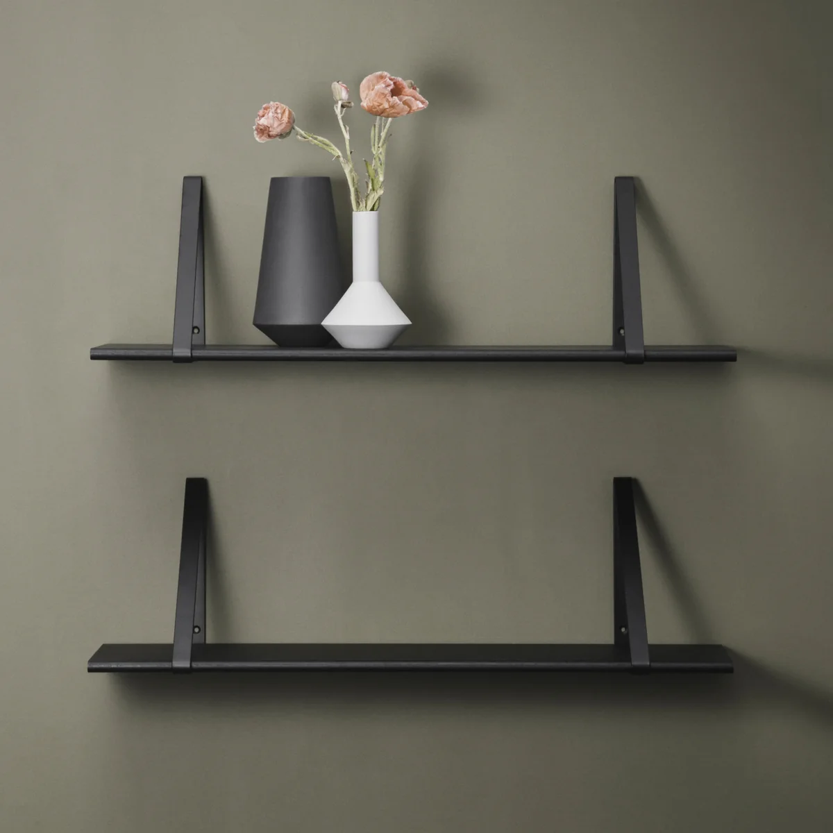 Das Shelf Hangers Regalsystem besteht aus zwei Elementen: Einem Regalboden aus Eichenfurnier in gebeizter, geölter oder geräuchter Variante sowie jeweils zwei lackierten Aufhängungen, die sich frei miteinander kombinieren lassen.