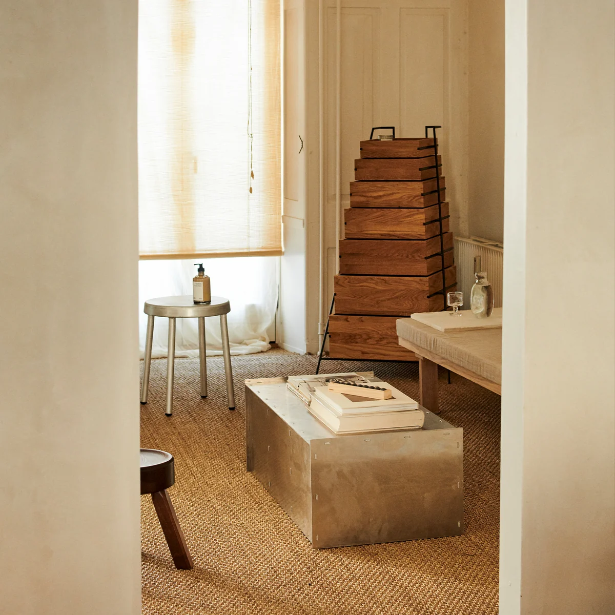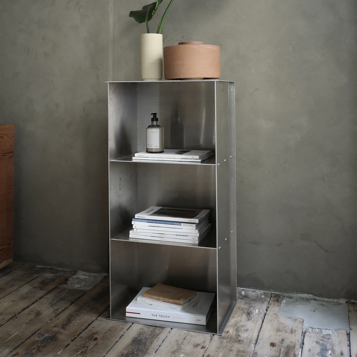 Das Rivet Case von Frama bietet die Möglichkeit, mit verschiedenen Variationen der visuellen Montage zu experimentieren. Das geradlinige Design wird von Hand lasergeschnitten und gehämmert, wodurch es die perfekte Mitte zwischen Handwerk und industrieller Produktion findet. Mit einer praktischen Niet-/Zapfentechnik entwickelt, wird das Maximum an Eigenschaften aus dem Aluminium rausgeholt. Das unbehandelte Aluminium präsentiert eine industrielle und ästhetische Optik, die dem Raum eine sehenswerte Note verleiht. Das Design entspringt der Feder von Jonas Trampedach aus dem Jahre 2014.