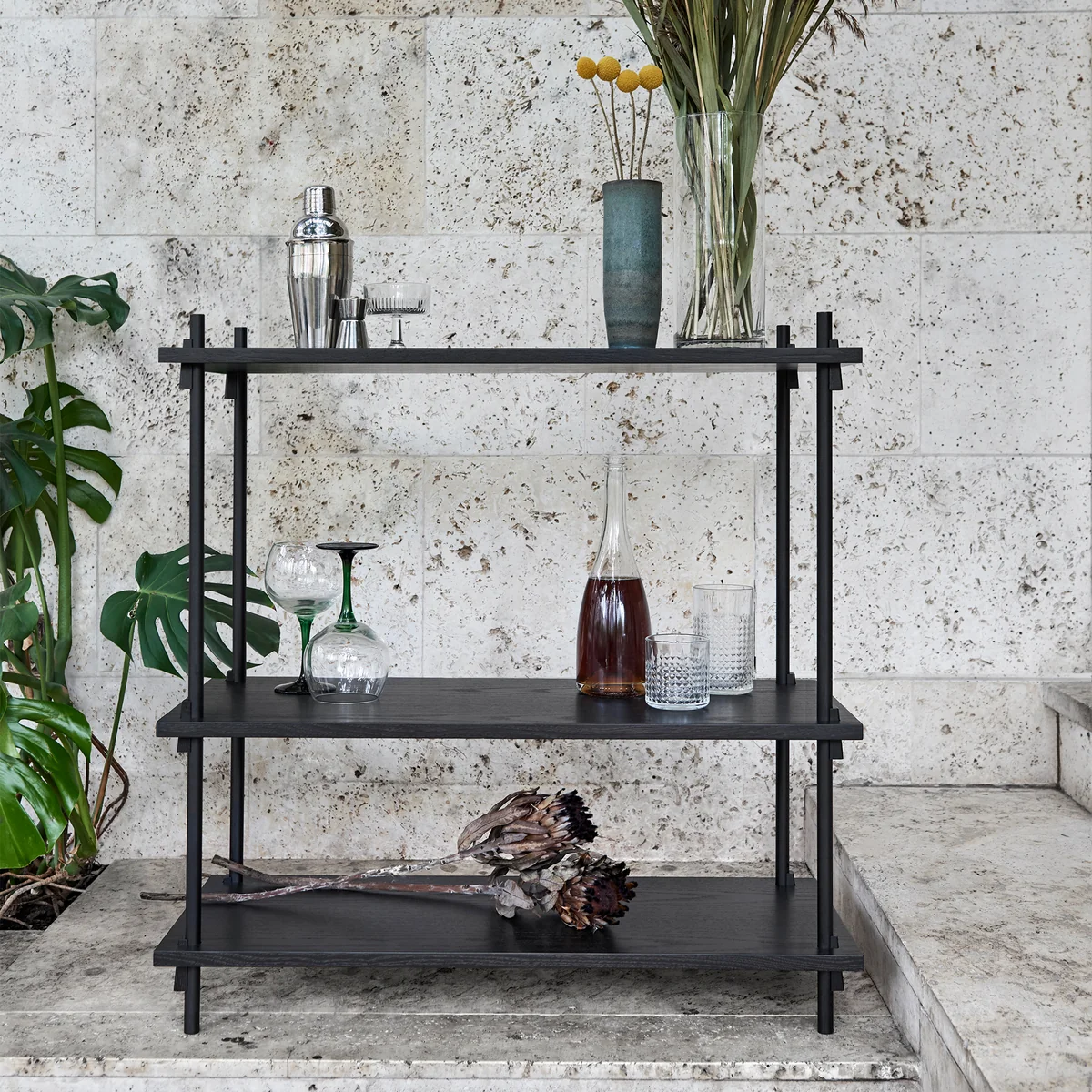 Da das Regalsystem sowohl in der Breite als auch in der Höhe erweitert werden kann und somit unendlich viele Möglichkeiten bietet, kann es für zahlreiche Einrichtungen und Zwecke genutzt werden. Als klassisches Bücherregal im Wohnzimmer, Küchenregal für Geschirr oder Aktenschrank im Büro kann das Shelving System dienen und auch als alternativer Raumtrenner macht es eine hervorragende Figur.