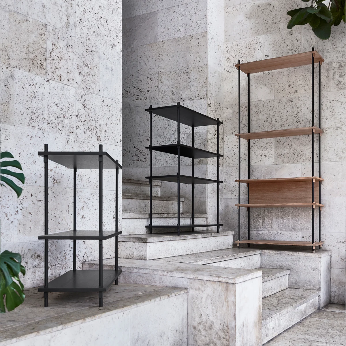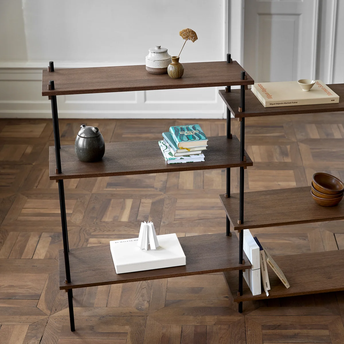 Gefertigt sind die Böden aus MDF Platten mit Eichenfurnier in verschiedenen Varianten, während das Gerüst aus pulverbeschichtetem Stahl besteht. Die hier bereits vorkonfigurierten Regale können je nach Belieben erweitert werden, sodass ein System entsteht, das den persönlichen Bedürfnissen vollkommen gerecht wird.