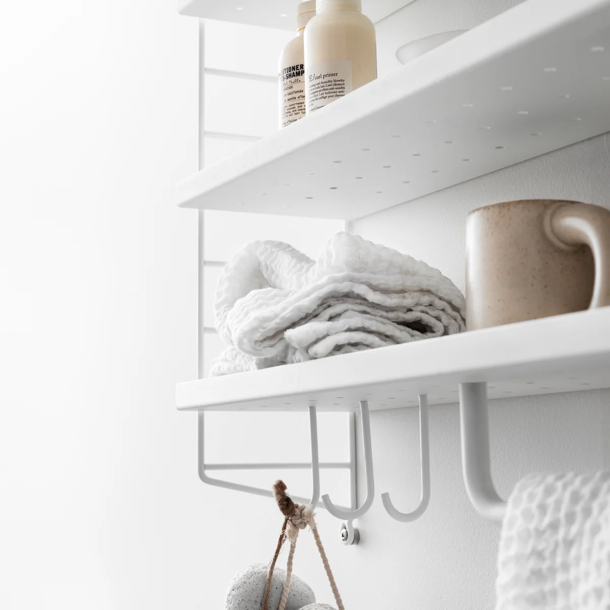 Passend dazu erhältlich sind die praktischen Haken, mit denen auch die Unterseite des Regalbodens genutzt werden kann.