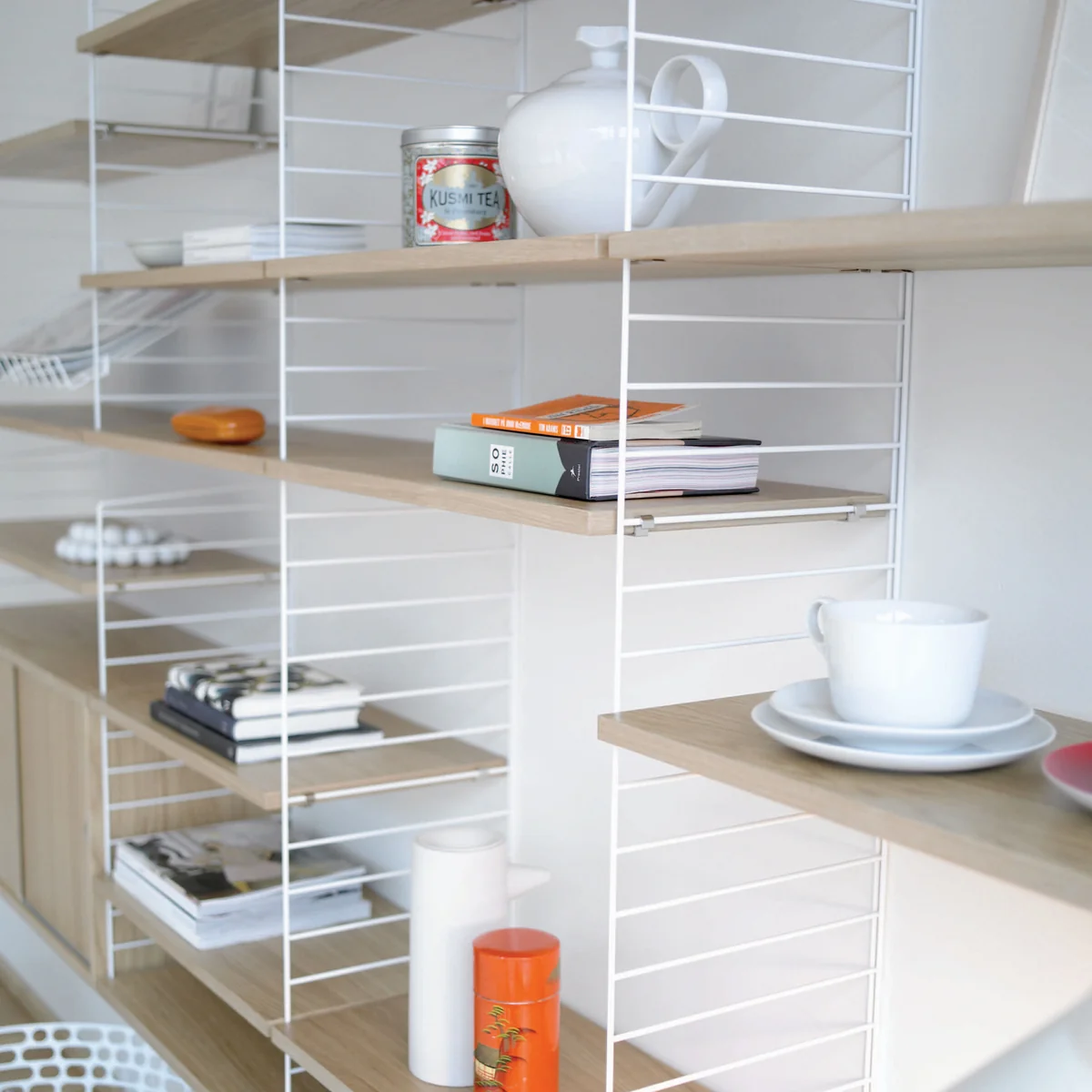 Damit ist das Regal von Designer Nisse Strinning nicht nur als Bücherregal im Wohnzimmer ideal. Auch für die Aufbewahrung in der Küche, im Flur oder für das Kinderzimmer bietet das String-Regal ausreichend Platz, um Accessoires, Bücher, Utensilien und Andenken stilvoll in Szene zu setzen.