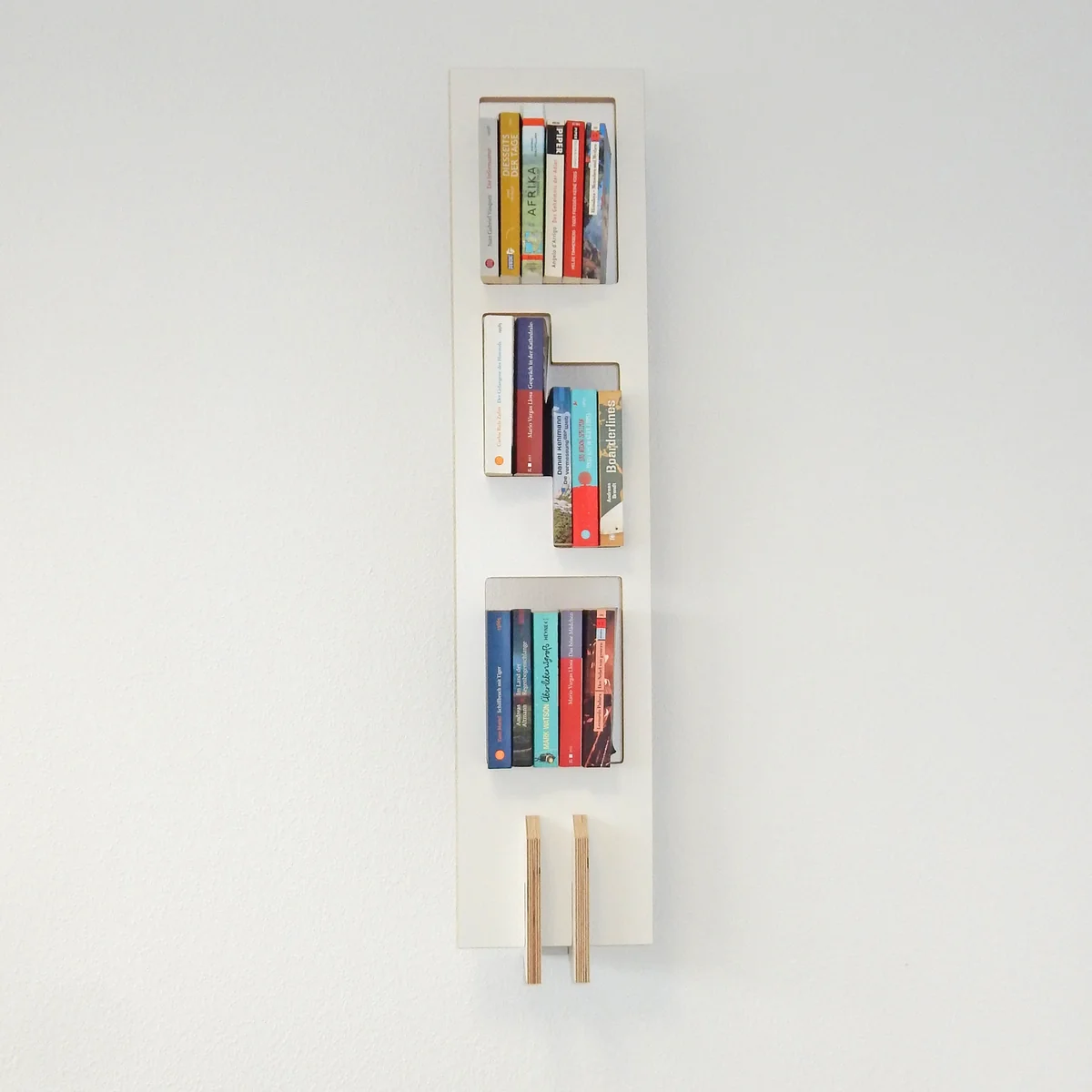 Das Regal wird aus multiplex Birkenholz in Weiß hergestellt und ist mit einer Breite von 25 cm ideal für schmalere Wandflächen. Besonders gut zur Geltung kommt das Regal zu mehreren arrangiert.