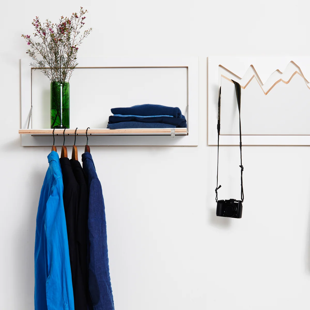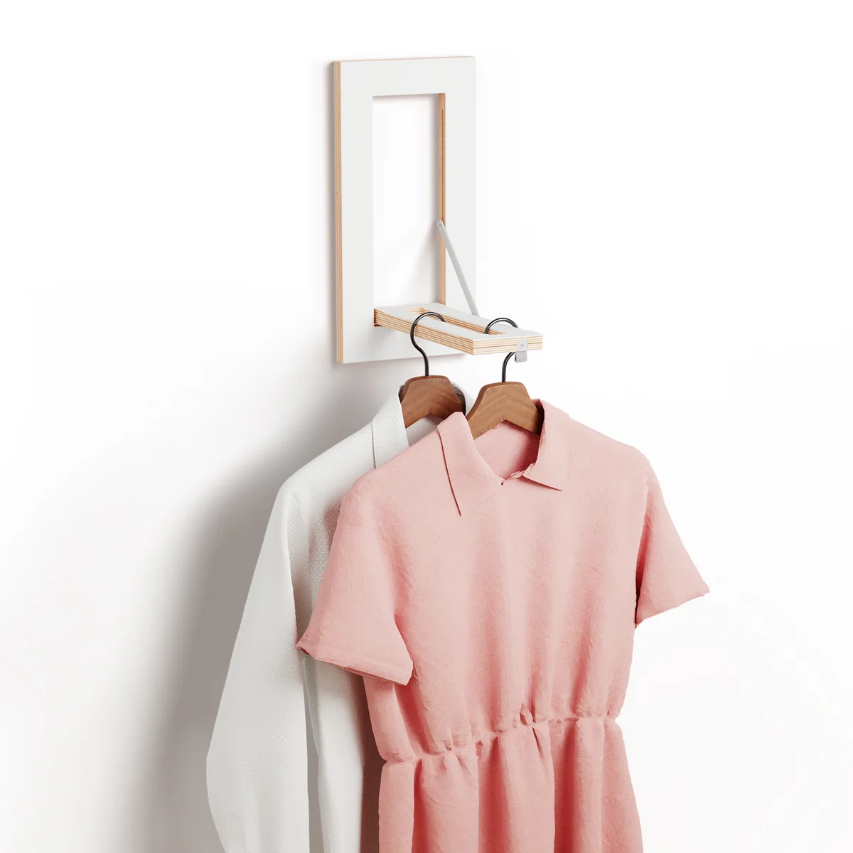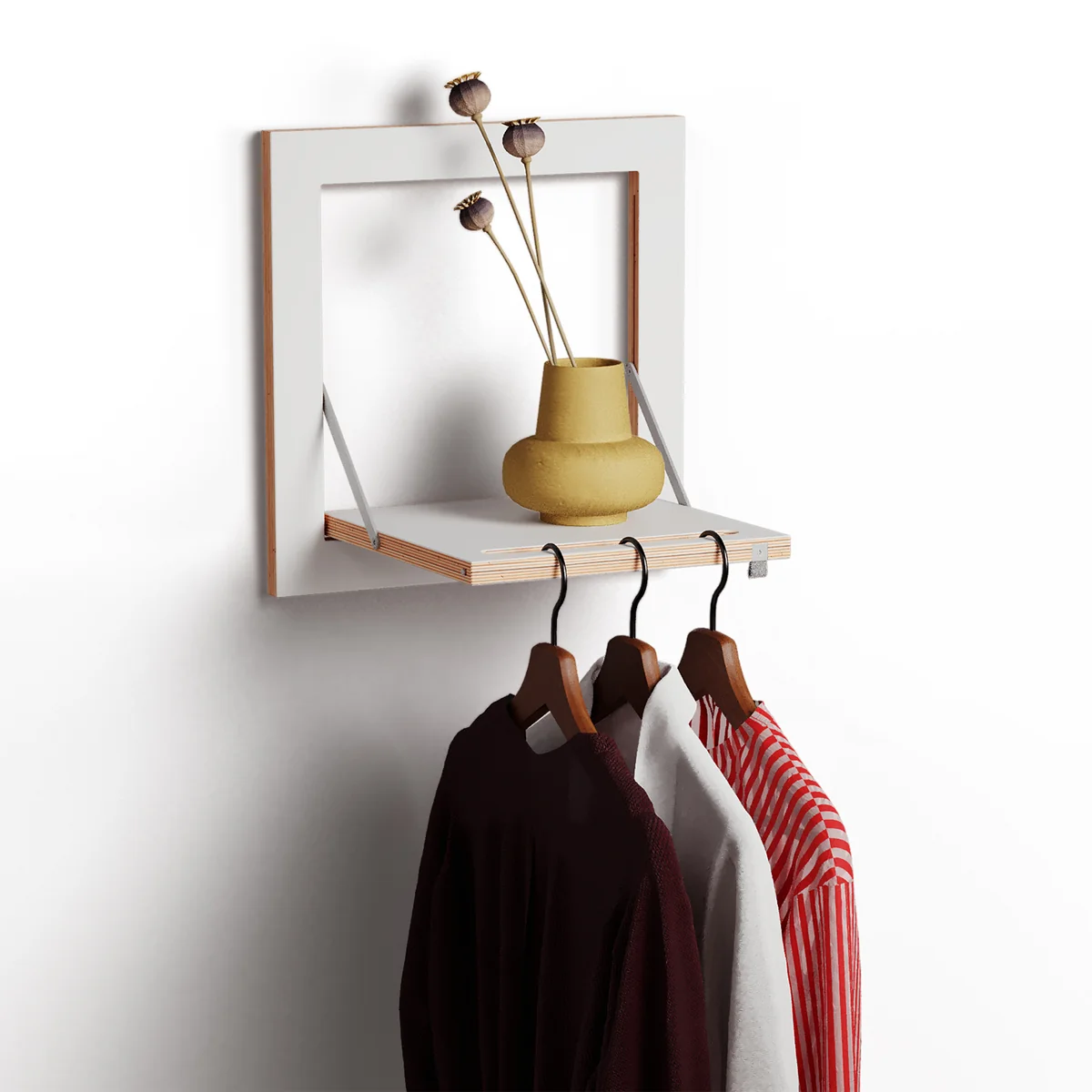 Die Fläpps Kleiderstange von Ambivalenz erscheint auf den ersten Blick wie ein gewöhnliches Wandregal von Ambivalenz und ist erst auf den zweiten Blick, wenn die Garderobe ausgeklappt wurde, als Kleiderstange mit zusätzlicher Ablage zu erkennen. Zusammengeklappt weist nur ein schmaler Schlitz auf ihre zusätzliche Funktion hin. An der Garderobe können mittels Haken und Kleiderbügel Mäntel, Jacken, Taschen, Schals und vieles mehr einen Platz finden. Die Ablage ist für Schlüssel, Lesebrille und Portemonnaie gedacht.