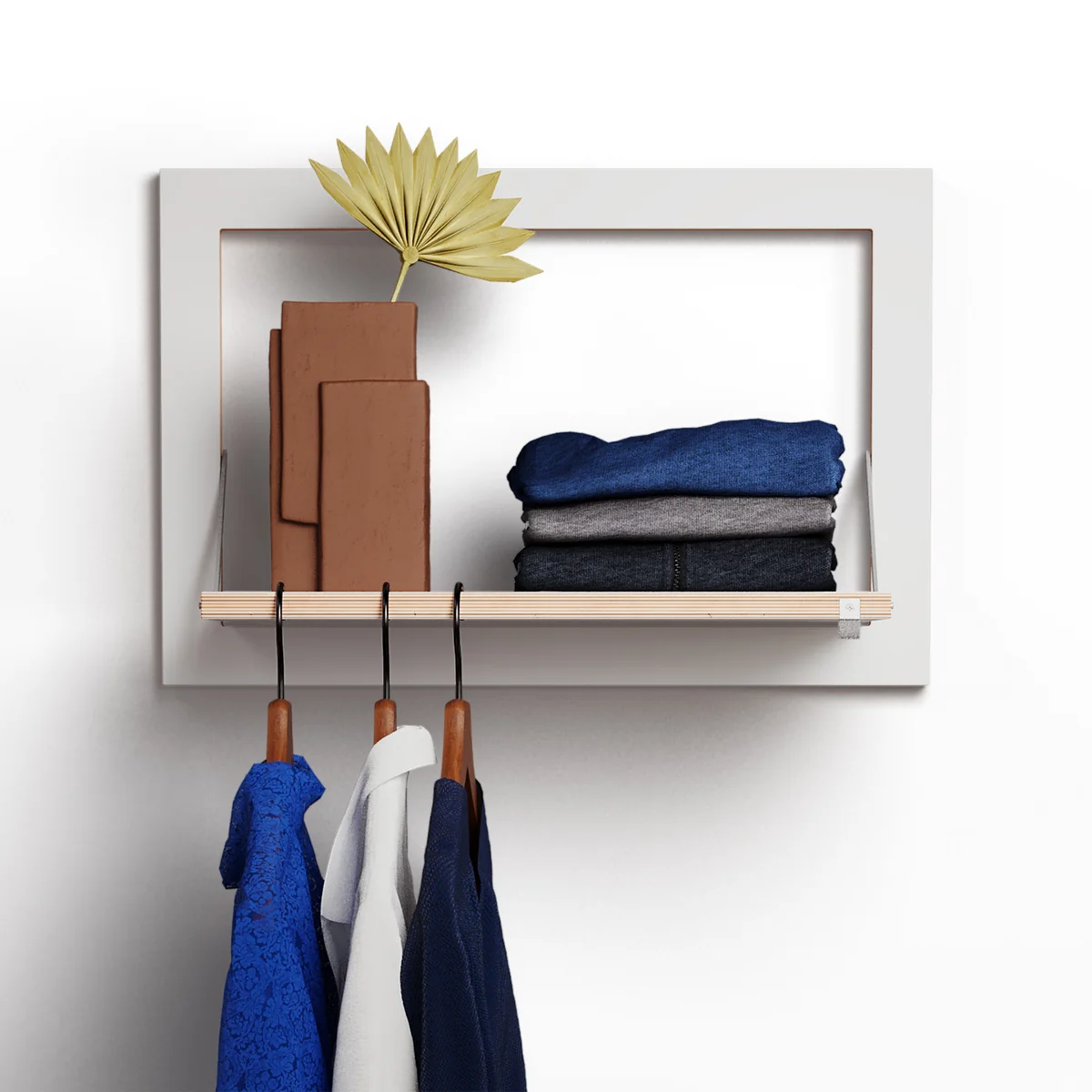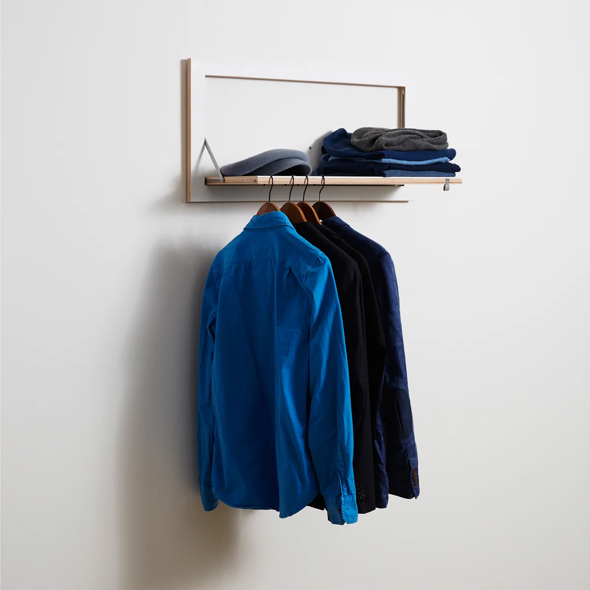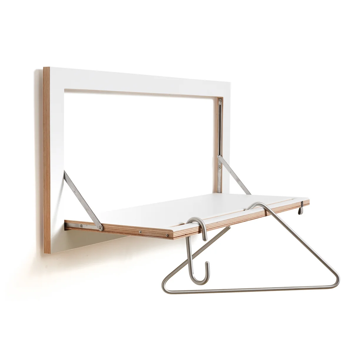 Die Fläpps Kleiderstange von Ambivalenz erscheint auf den ersten Blick wie ein gewöhnliches Wandregal von Ambivalenz und ist erst auf den zweiten Blick, wenn die Garderobe ausgeklappt wurde, als Kleiderstange mit zusätzlicher Ablage zu erkennen. Zusammengeklappt weist nur ein schmaler Schlitz auf ihre zusätzliche Funktion hin. An der Garderobe können mittels Haken und Kleiderbügel Mäntel, Jacken, Taschen, Schals und vieles mehr einen Platz finden. Die Ablage ist für Schlüssel, Lesebrille und Portemonnaie gedacht.