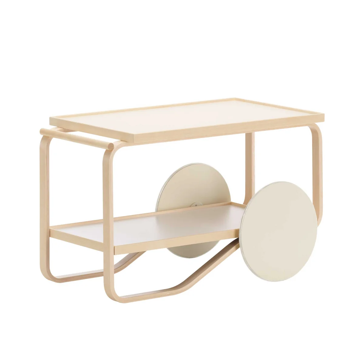 Der Servierwagen 901 ist ein Entwurf des finnischen Designers Alvar Aalto, der sich hierbei, zusammen mit seiner Frau Aino Aalto, von der britischen Teekultur inspirieren liess. Ausgestattet ist der rollende Wagen mit zwei Rädern und einem Gestell aus gebogenem Schichtholz, das nach dem Prinzip des Bugverfahrens gefertigt wurde. Bereits in den 1920er Jahren experimentiert Aalto mit mit dem Werkstoff Holz, versucht es in eine geschwungene Form zu bringen und findet letztendliche eine Methode, um dünne, verleimte Holzschichten unter Wärmeeinfluss zu biegen.