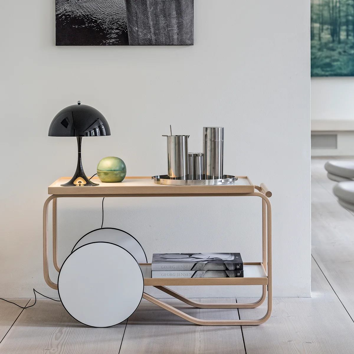 Der Servierwagen 901 lässt sich klassisch als Teewagen nutzen, kann jedoch auch als Beistelltisch, dekoriert mit einer Leuchte, Büchern oder einem Blumenstrauss hervorragend in Szene gesetzt werden. Auf den Linoleumplatten lassen sich Gegenstände aller Art auf zwei Etagen nach Wunsch arrangierten.
