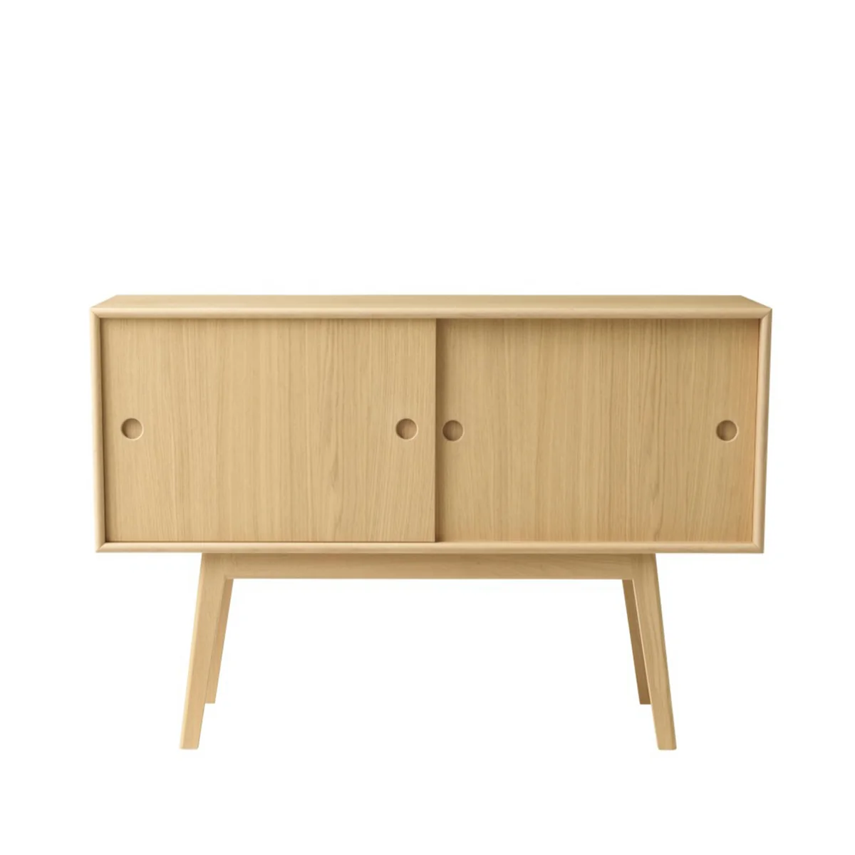 Das A83 Butler Sideboard ist Teil der Butler-Serie von FDB Møbler, die vom Designer-Duo Foersom & Hiort-Lorenzen entworfen wurde. Das schlichte skandinavische Design überzeugt durch hölzerne Beine, die den Korpus des Sideboards in die Höhe heben. Je nach Variante, sind die Türen farblich abgesetzt oder naturfarben gehalten. Durch kleine runde Aussparungen können die Schiebetüren ohne Probleme nach links und rechts geschoeben werden. Dahinter lassen sich allerlei Kleinigkeiten verstauen, die nicht gleich auf den ersten Blick entdeckt werden sollen. Das Sideboard aus der Butler-Serie eignet sich wunderbar für das Wohnzimmer oder den Flur, wo es sich harmonisch in die Einrichtung einfügt.