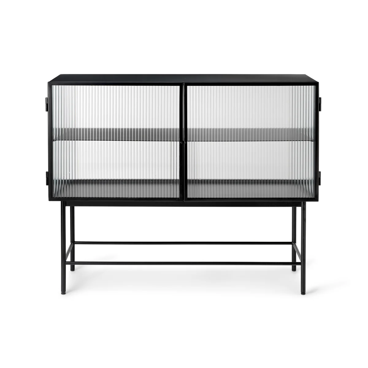 Das Haze Sideboard von Ferm Living ist eine stilvolle Aufbewahrungsmöglichkeit für jedes Ambiente. Als Basis des Sideboards dient ein filigranes, gradliniges Metallgestell. Auf ihm thront das Schrankelement mit zwei geriffelten Glastüren, was für eine luftig-leichtes Erscheinung sorgt. Geschirr, Akten und andere Gegenstände lassen sich darin praktisch verstauen. Durch die Glastüren wird ein verschleierter Blick ins Innere des Schrankmoduls freigegeben.