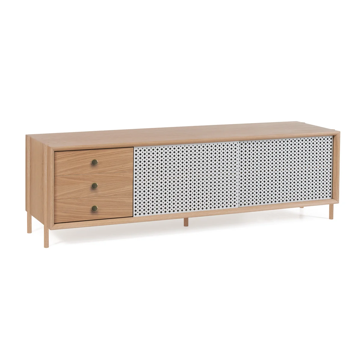 Zusätzlich zu den Schiebetüren verfügt das moderne Sideboard über Schubladen, in denen Zeitschriften, Fernbedienung und andere Dinge verstaut werden können. Denn dank der seiner schmalen Silhouette eignet sich das Sideboard auch hervorragend als TV-Bank im Wohnzimmer.