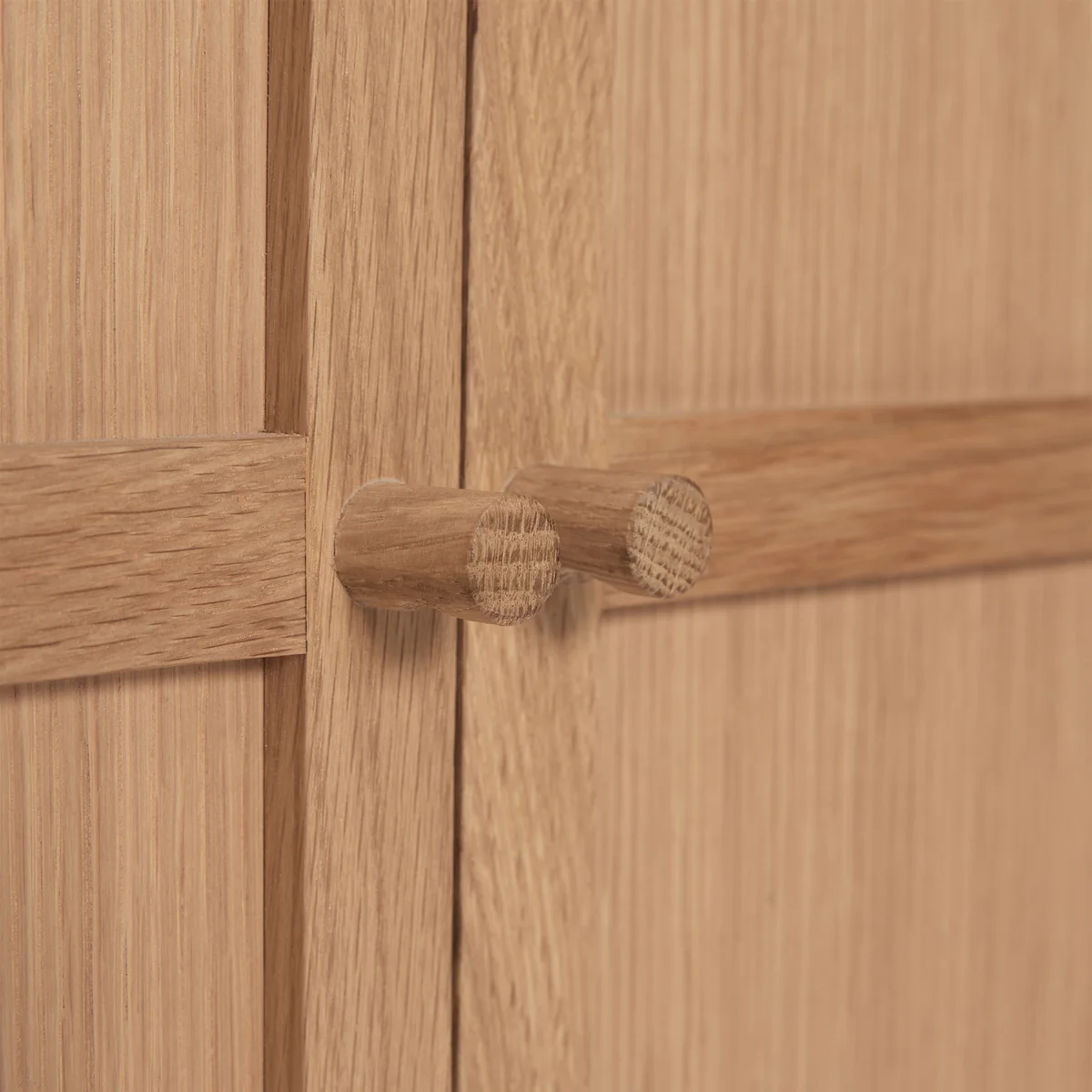 Gefertigt aus FSC®-zertifiziertem Eichenholz, zeichnet sich der Schrank durch seine Robustheit und Haltbarkeit aus. Die Abnutzung dieses besonderen Holzes ist gering - somit kann der Schrank über mehrere Jahre verwendet werden.