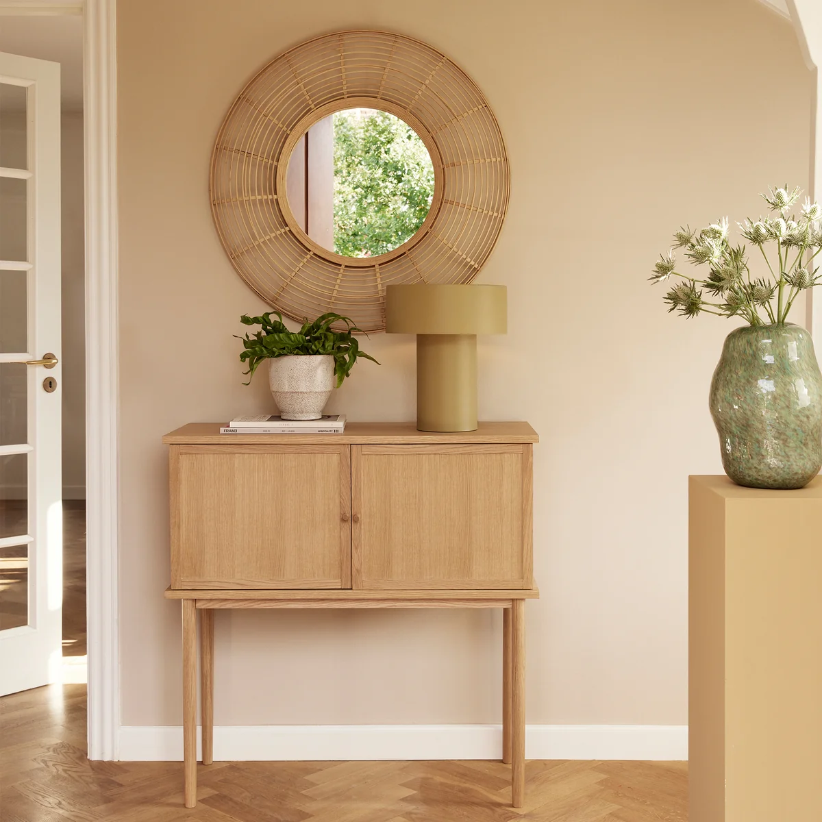 Hergestellt aus FSC®-zertifiziertem Eichenholz und Eichenfurnier, ist die Konsole langlebig und besonders robust. Die natürliche Optik und Maserung verleihen dem Wohnraum eine wohnliche und gemütliche Nuance, die sich durch weitere dekorative Objekte ergänzen und ausführen lässt.