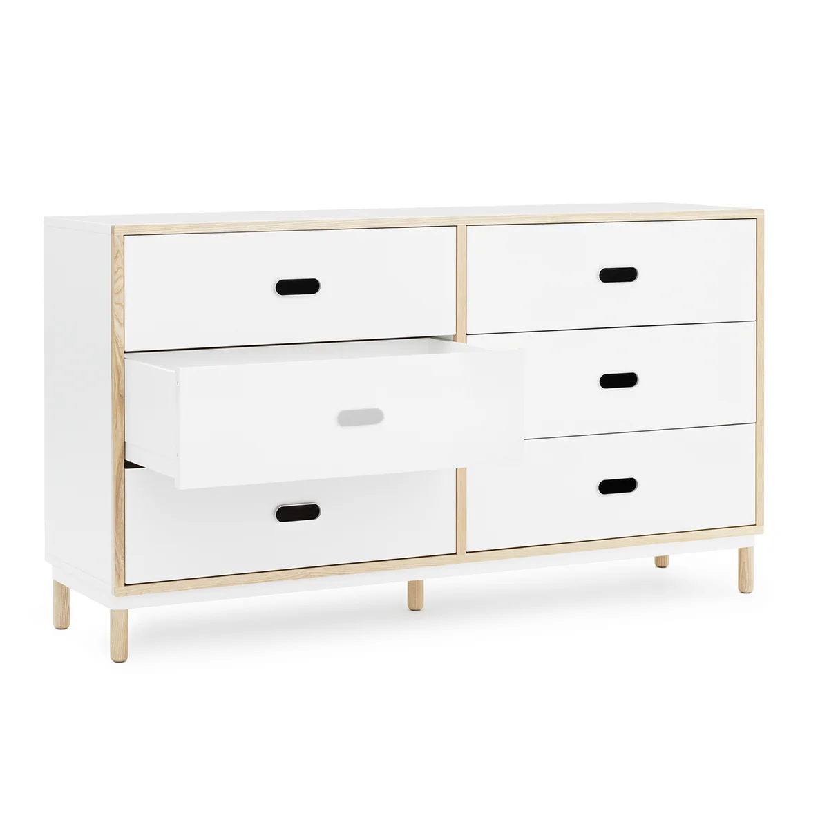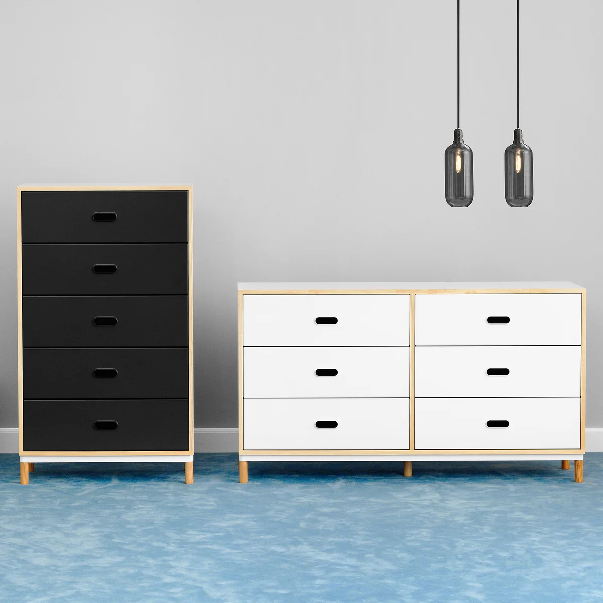 Besonderer Fokus liegt auf den wohlüberlegten und praktischen Details und Materialien. So sind die Öffnungsgriffe charakteristisch für die Kabino Serie. Das Besondere daran: Dank der Soft Close Funktion schließen die Schubladen vollkommen geräuschlos. Die Kombination von Stahl und Holz verleiht der Kommode außerdem einen modernen, industriellen Look, der sich dank reduzierter Formensprachen vielseitig in unterschiedliche Wohnbereiche integrieren lässt.