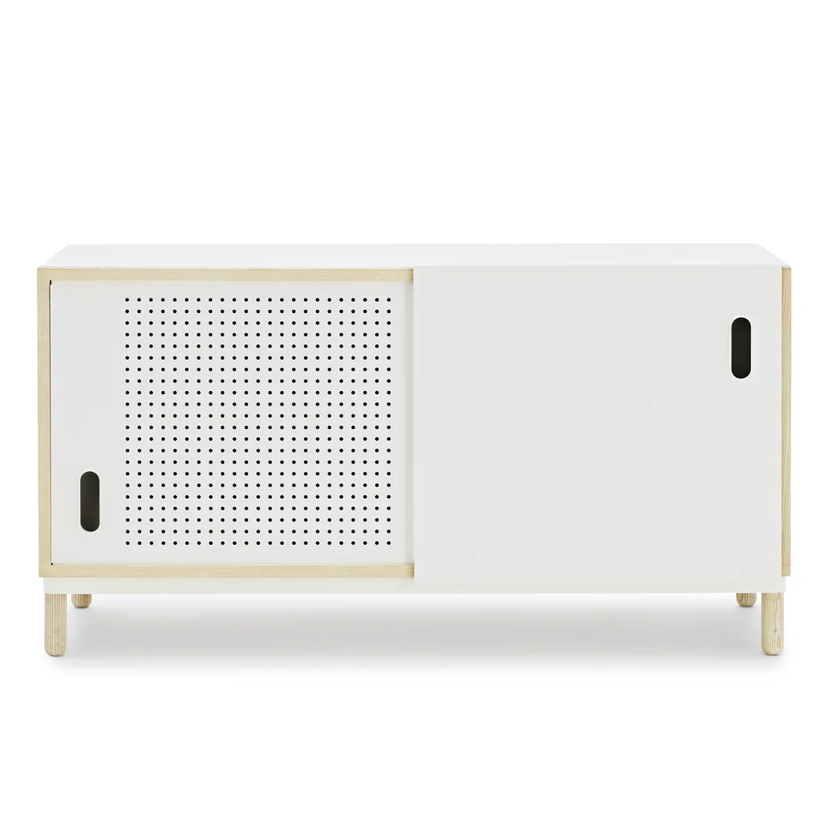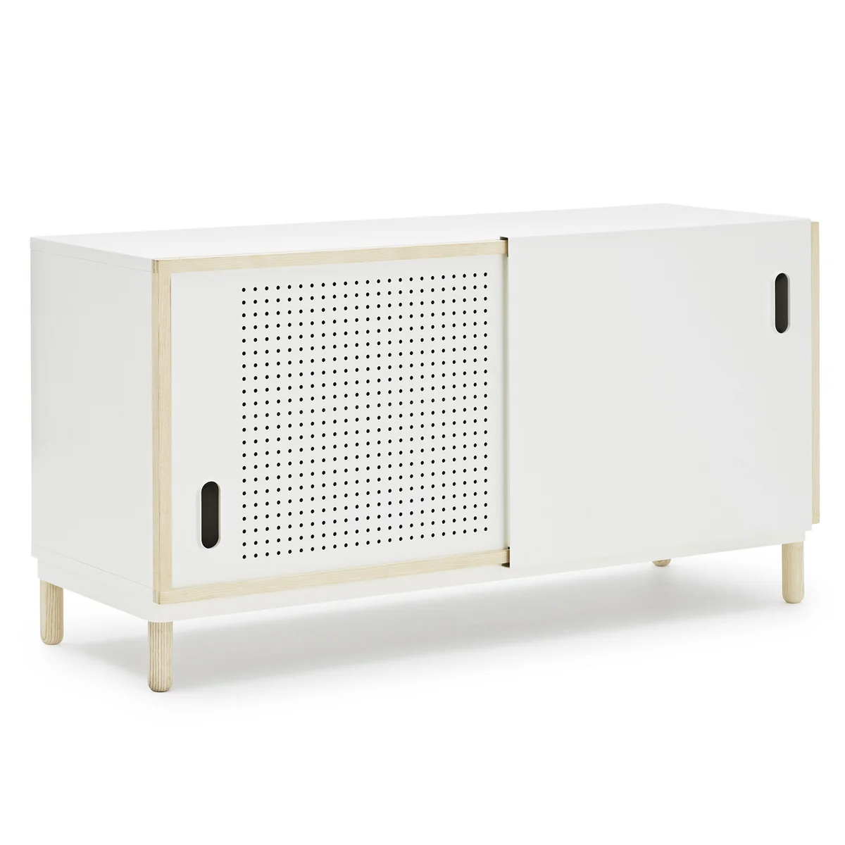 Kabino ist ein schlichtes, vielseitiges Sideboard mit exklusiver Optik, entworfen von Simon Legald. Eine der beiden Schiebetüren ist als elegante Lochblechplatte gearbeitet, während der Rahmen aus Esche dem Sideboard die weiche und warme Optik verleiht. Kabino fügt sich sehr gut in die meisten Einrichtungsstile ein.