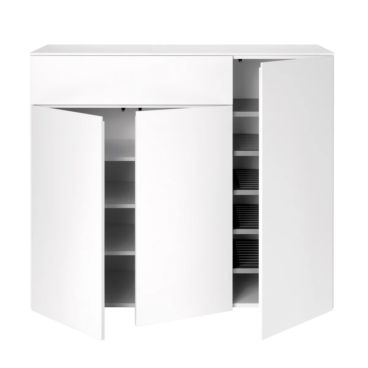 Die Kommode wahlweise mit Türen und / oder Schubkästen lässt im Innern auf Fachböden und Schuhböden genügend Platz für Anziehsachen, Accessoires und Schuhe. So können die Kleidungsstücke für draußen im Eingangsbereich dezent sortiert und verstaut werden und Schals, Schuhe und der Regenschirm liegen griffbereit in der Nähe der Haustür.