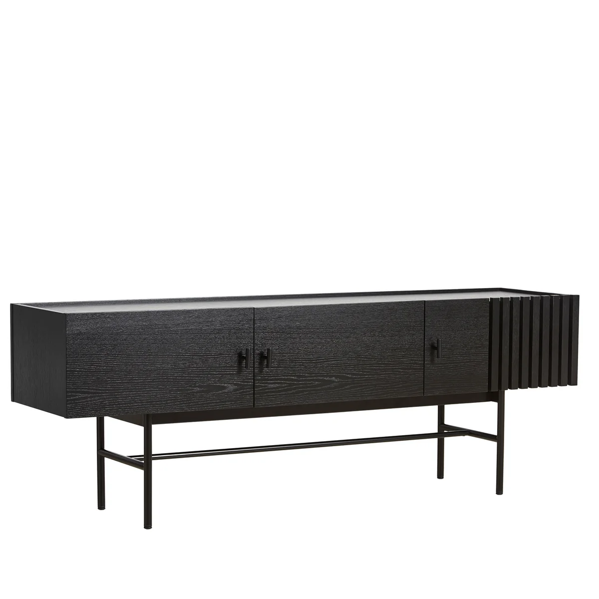 Die Sideboard-Serie Array von Woud ist inspiriert von der Holzschieferverkleidung moderner Gebäude. Entworfen wurden die Sideboards von Says Who. Die geometrische Form und die Vertiefungen im Holz sorgen für einen starken visuellen Effekt. Die schlanken Beine heben das Sideboard vom Boden ab und bilden einen eleganten Kontrast zum kantigen Gehäuse des Sideboards. Die Illusion von Transparenz weckt die Neugierde im Betrachter, was sich wohl hinter den geschlossenen Türen verbirgt.