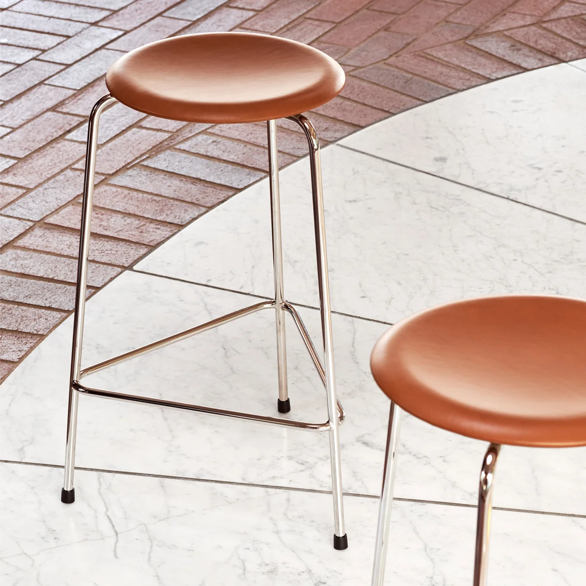 Der Dot Barhocker von Fritz Hansen ist ein Entwurf des dänischen Designers Arne Jacobsen, den er im Zuge des Designprozesses für den Ameise Stuhl in den 50er Jahren kreierte. Die Ähnlichkeiten zwischen den beiden Sitzobjekten sind deutlich zu erkennen, sodass sie sich auch hervorragend miteinander kombinieren lassen.