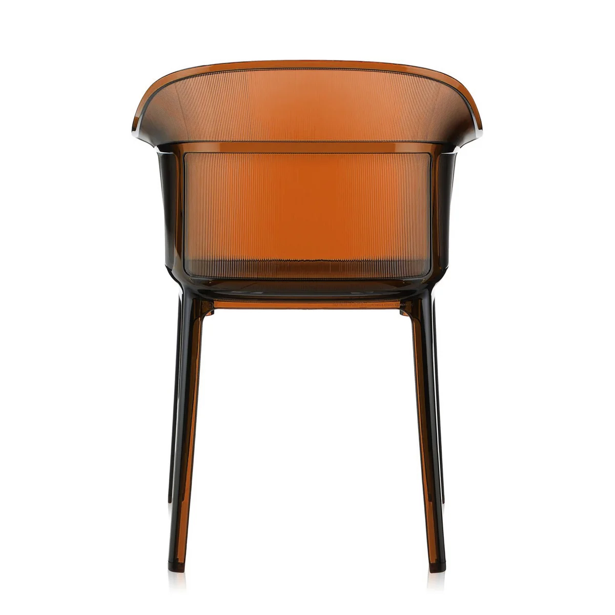 Der Papyrus Armlehnstuhl interpretiert den klassischen Korbstuhl neu und kombiniert eine elegante Linienführung mit modernen Materialien. Die charakteristische vertikale Rändelung verläuft über die gesamte, sanft geschwungene Rückenlehne und verleiht dem durchscheinenden Stuhl seine besondere Struktur. Trotz seiner Leichtigkeit bietet der Papyrus überraschend hohen Sitzkomfort.