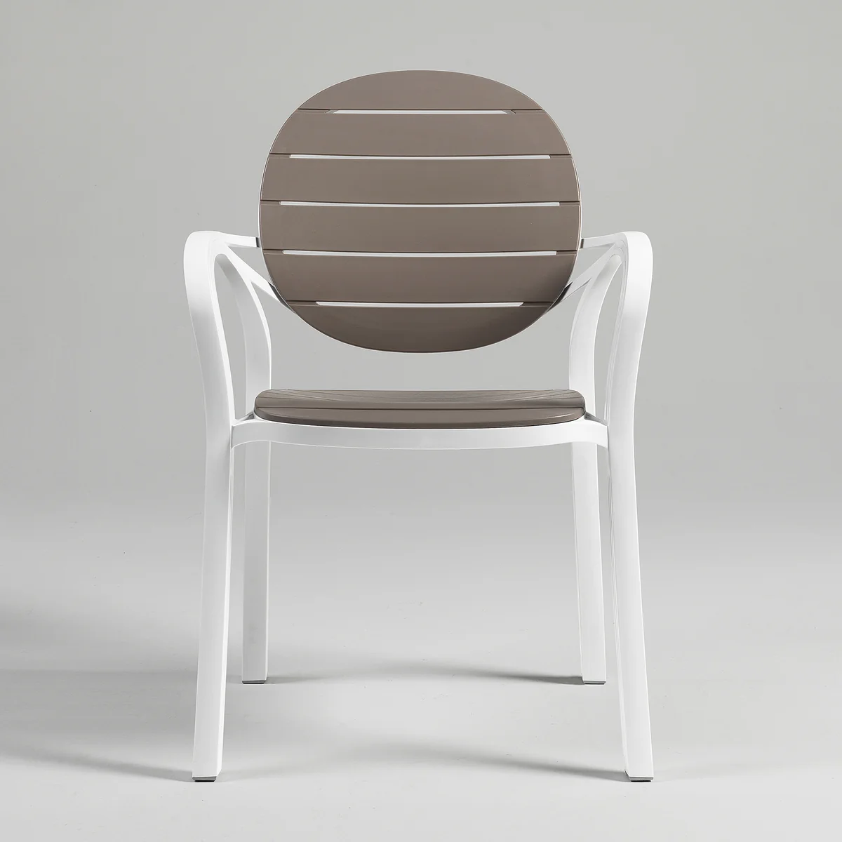 Der Palma Armlehnenstuhl von Nardi hat eine typisch italienische Anmutung, die jeden Balkon und jede Terrasse auf stilvolle Weise ergänzt. Seine Sitzfläche und Rückenlehne bestehen aus breiten Dauben aus glasfaserverstärktem Kunststoff. Die Beine verzweigen sich in schmalen Streifen nahe der Sitzfläche und Rückenlehne. Palma ist leicht und stapelbar.