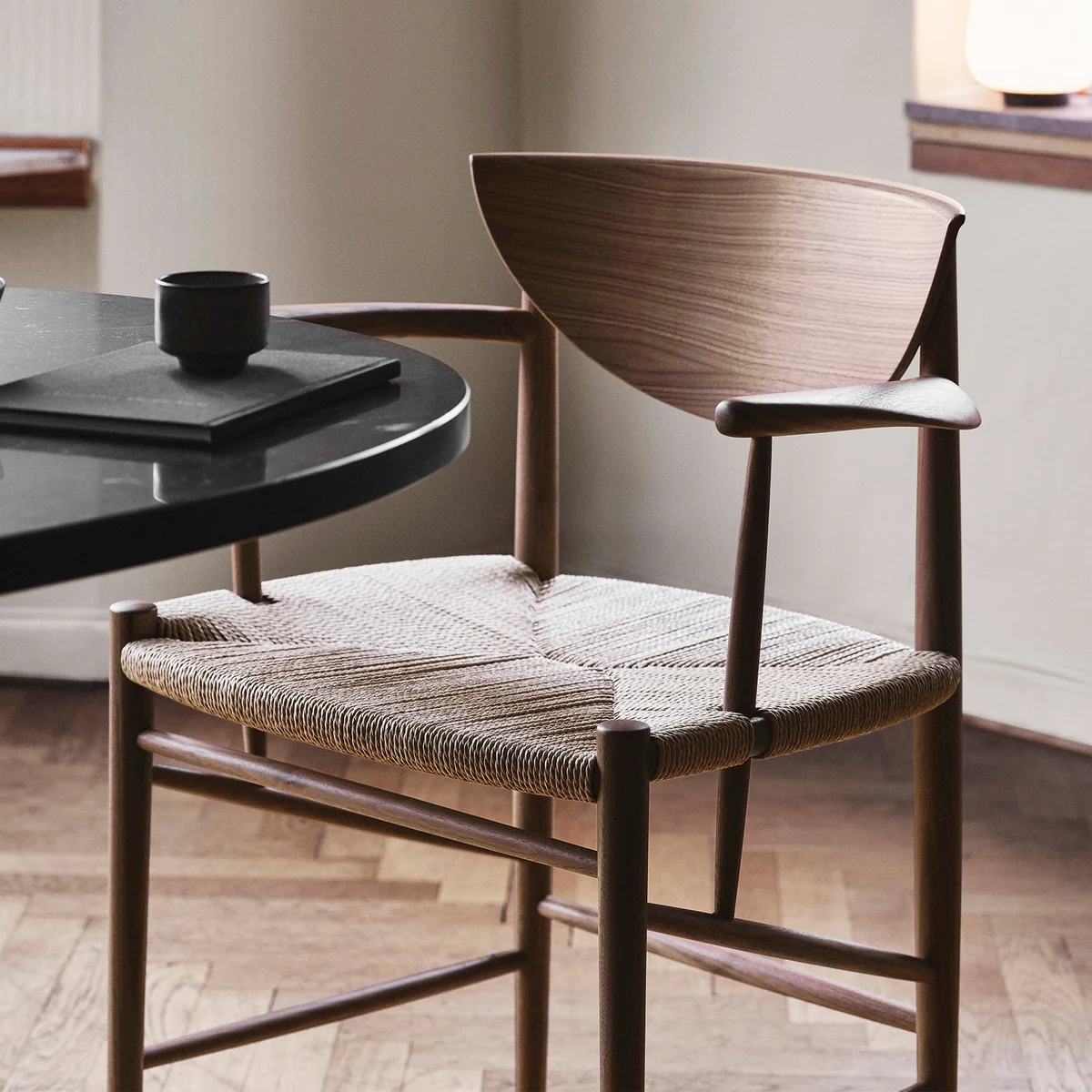 Der Armlehnstuhl ist aus gedrechseltem und gefrästem Massivholz aus Eiche oder Nussbaum mit einer formgepressten Rückenlehne und komfortablen Armlehnen gefertigt. Der Sitz wird aus mehr als 100 Meter Naturpapierkordel handgeflochten.