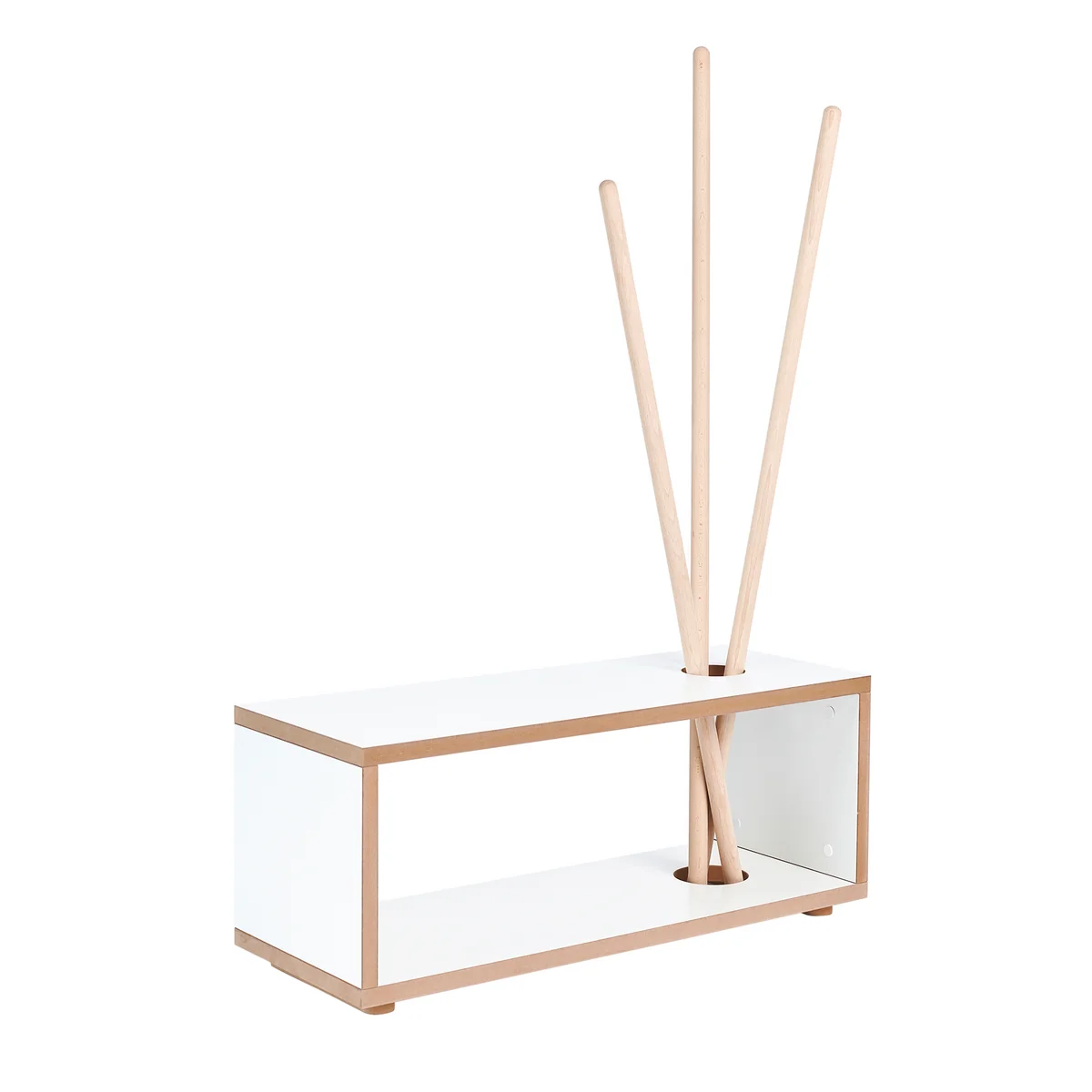Die ordnung Kinder Garderobe und Bank von Tojo ist ideal für die Kleinen und kann im Flur oder Kinderzimmer platziert werden. In der Sitzbank können Schuhe untergebracht werden, welche die Kinder bequem im Sitzen anziehen können. Drei unterschiedlich lange Stäbe sind zudem durch Löcher in der Sitzfläche gesteckt. Sie dienen zum Aufhängen von Pullovern, Jacken, Mützen, Schals und vielen weiteren Kleidern. Die ordnung Kinder Garderobe wird ihrem Namen gerecht und sorgt für Ordnung bei den Kleinen.