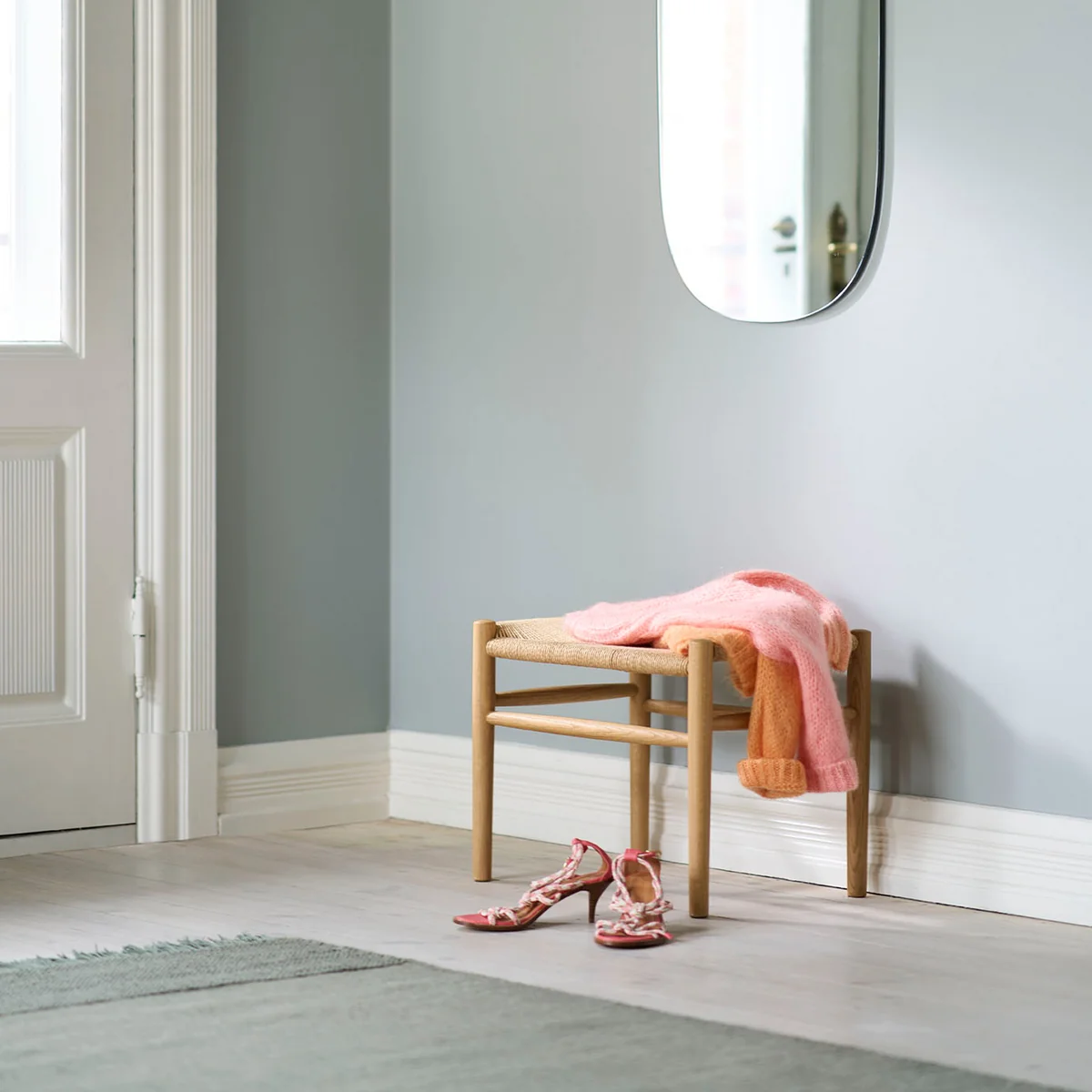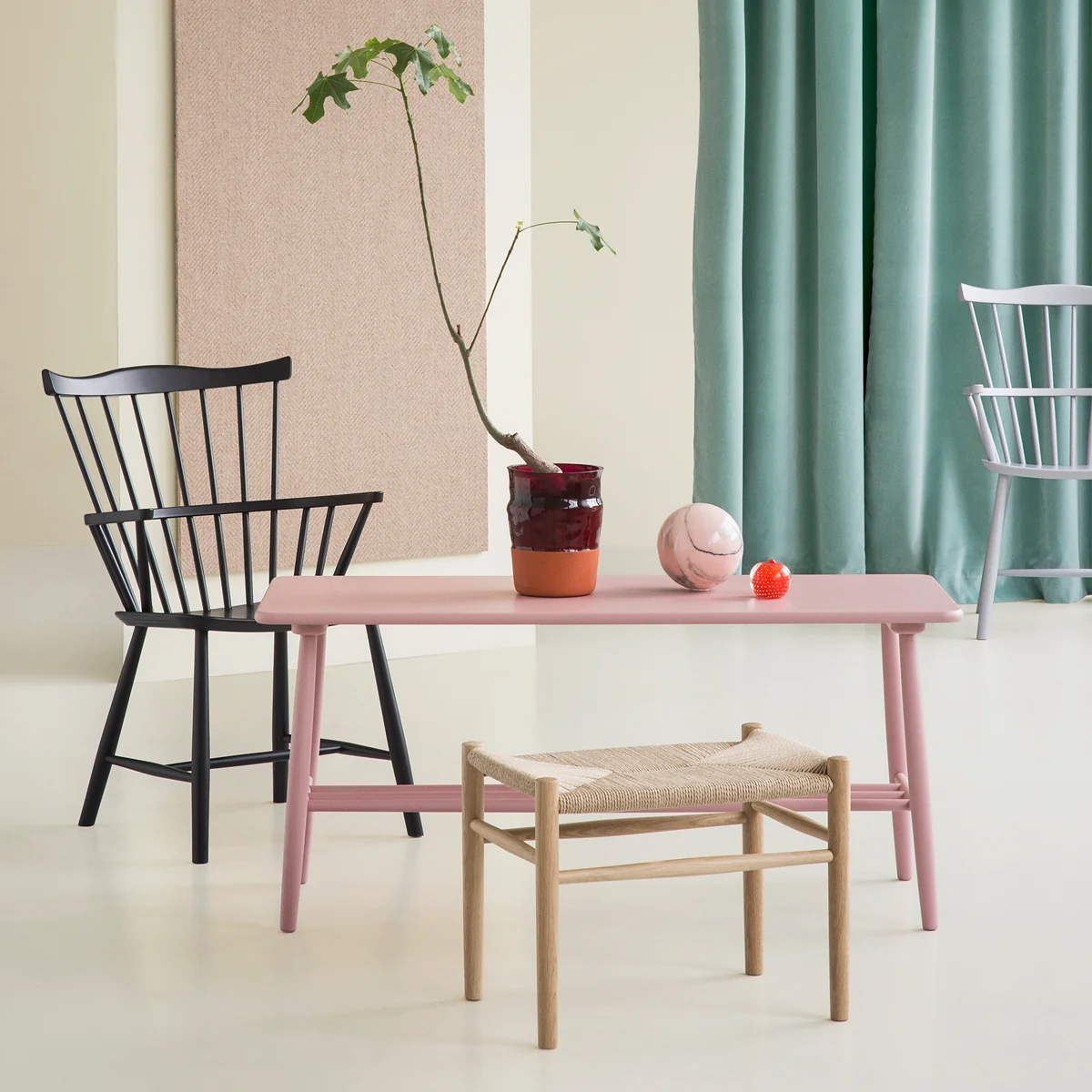 Gefertigt ist das Gestell des Hockers aus Buchenholz oder Eichenholz, während die Fläche mit einem Naturgeflecht bespannt ist. Die sorgt für einen natürlichen Look und setzt warme Akzente im Ambiente. Entworfen wurde der J83 Hocker von Jørgen Bækmark.