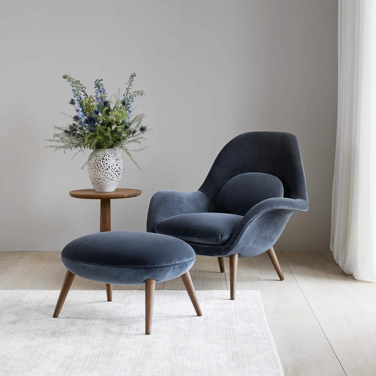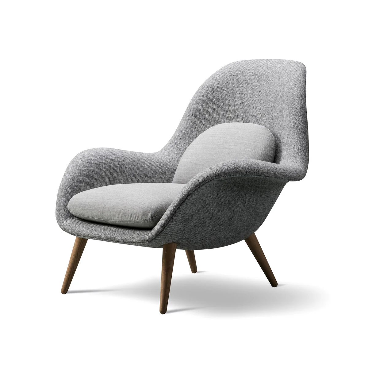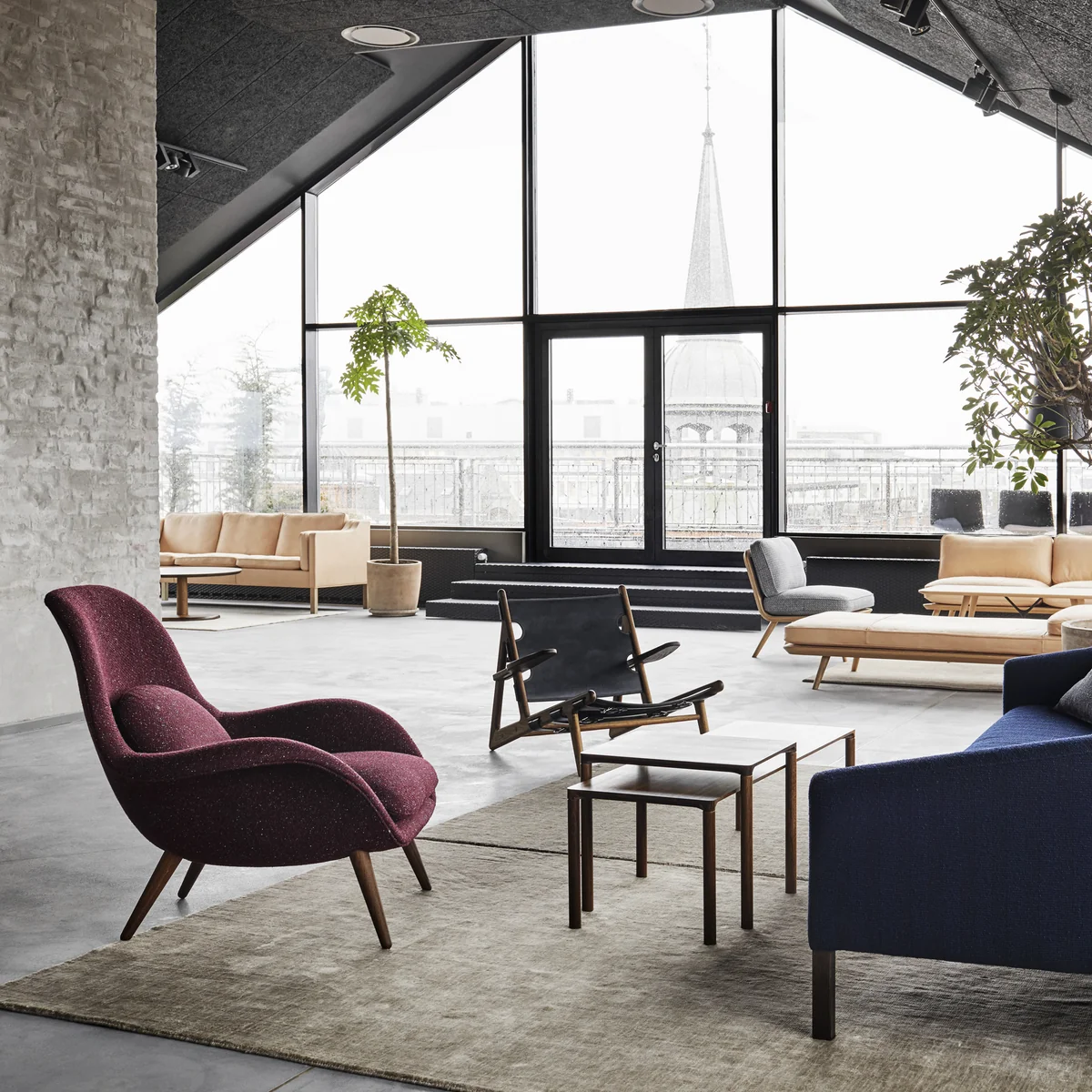 Der Swoon Sessel ist ein Entwurf des Designer-Teams von Space Copenhagen für Fredericia. Das Duo wollte eine Sitzgelegenheit schaffen, die eine Mischung aus Sessel und Lounge-Stuhl darstellt und dabei äußerst komfortabel ist und dennoch nicht viel Platz einnimmt.