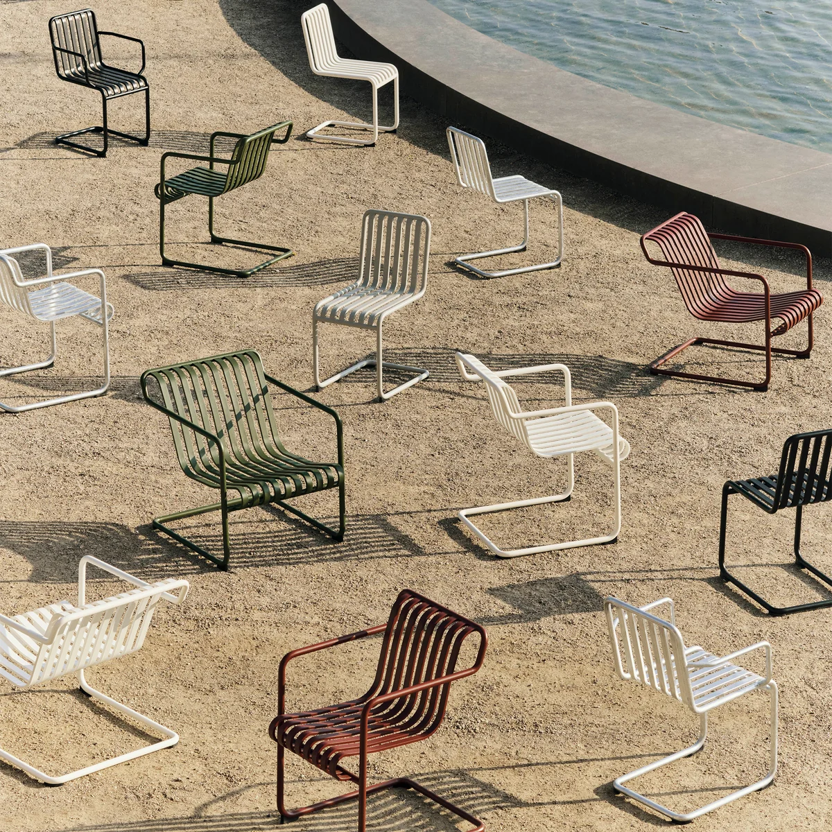Gefertigt aus pulverbeschichtetem oder feuerverzinktem Stahl, kombiniert der Palissade Lounge Chair Low hohe Wetterbeständigkeit mit außergewöhnlicher Stabilität. Die offen gestaltete Strebenform verhindert das Ansammeln von Regenwasser und lässt Licht und Luft frei zirkulieren – ein funktionales Detail, das sowohl optisch als auch praktisch überzeugt.