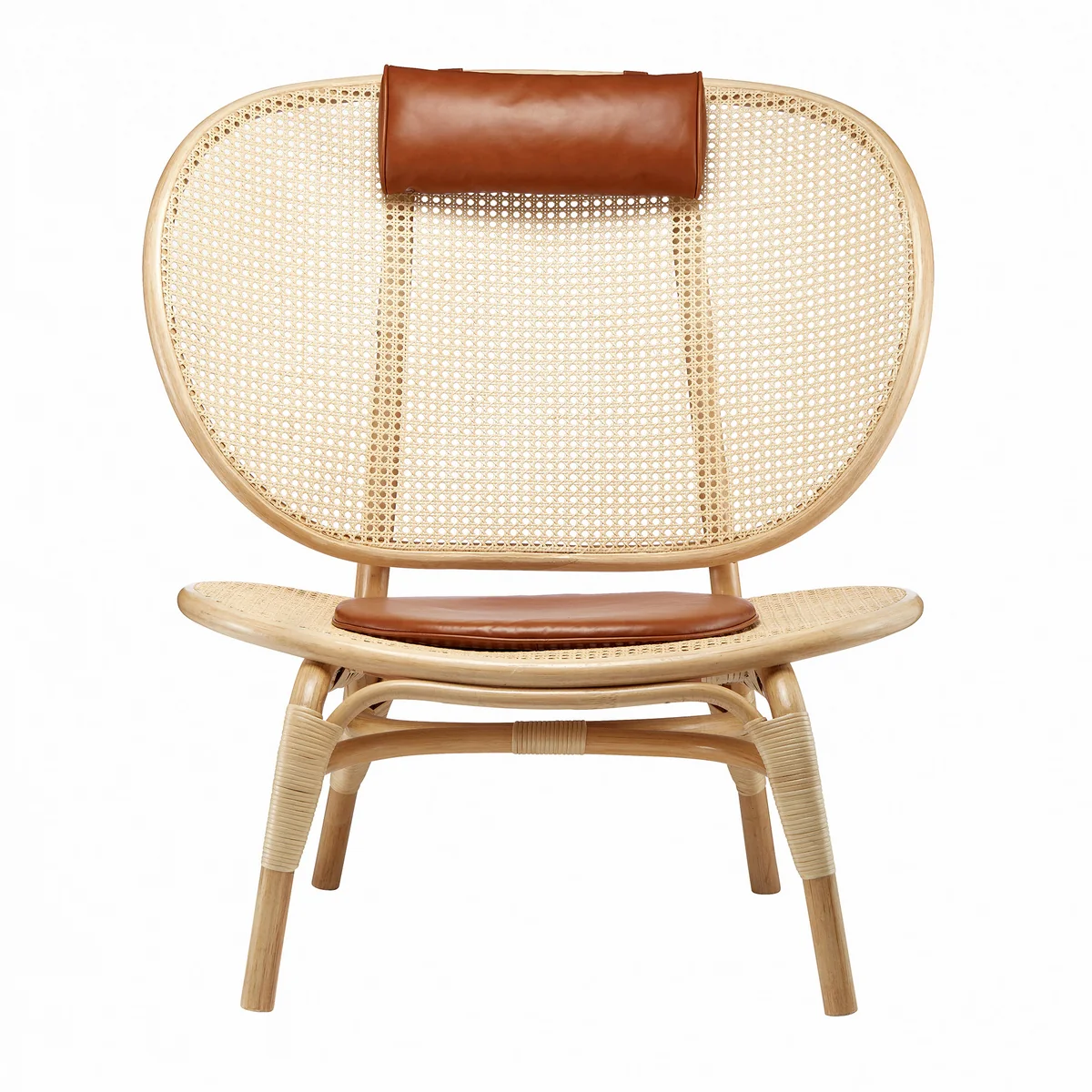 Sitz und Rückenlehne bestehen aus zwei großen, geformten Bambusrahmen mit eingelegtem französischem Rorgeflecht. Das halbtransparente Rohrgeflecht verleiht der großen Fläche einen leichten Ausdruck und unterstreicht die schöne Konstruktion. Zu dem Sessel gehören außerdem Sitz- und Nackenkissen aus Anilinleder. Sie sorgen für die extra Portion Komfort.