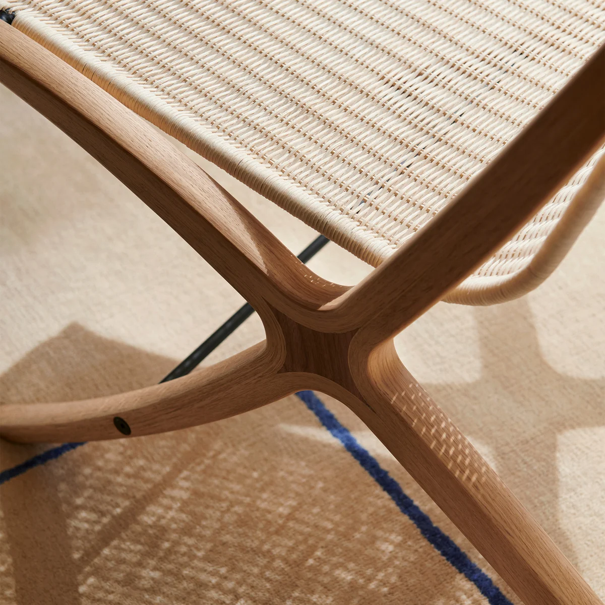 Der X HM10 Lounge Chair des Designerduos Hvidt & Mølgaard für &Tradition besticht mit seiner markanten, außergewöhnlichen Silhouette und seiner schlichten Ästhetik. Die dänischen Designer arbeiteten jahrelang mit dem Konzept eines laminierten Holzrahmens, welcher von alten hölzernen Tennisschlägern inspiriert war - Ergebnis war der X HM10 Lounge Chair. Furnierblätter werden zu einer Massivholzeinlage zusammengepresst, in Form gefräst und lackiert. Der Stuhl besteht des Weiteren aus natürlichem Rattan, welches um de pulverbeschichteten Edelstahlrahmen geflochten wird.