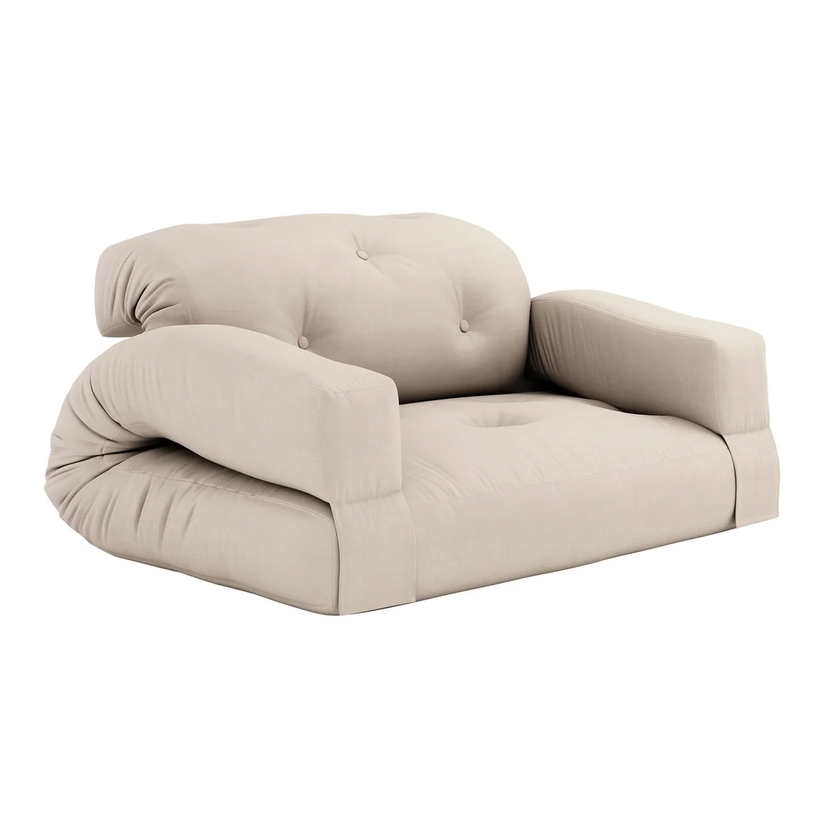 Hippo ist ein bequemes Futonsofa, das sich leicht in eine Matratze verwandeln lässt. Indem man die Rückenlehne des Sofas löst und die Armlehnen anhebt, legt sich Hippo flach hin und wird zu einer dicken, weichen Matratze, die sich perfekt für Gäste und Übernachtungen eignet.