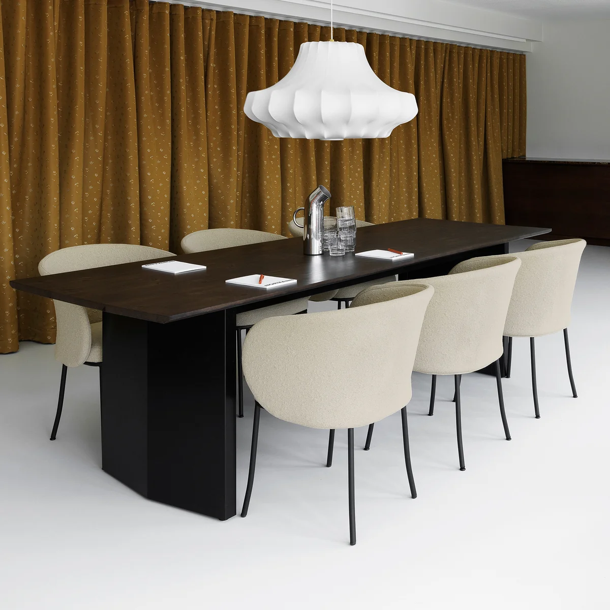 Die sanft geschwungene Rückenlehne folgt den natürlichen Körperkonturen und bietet auch bei längerem Sitzen angenehmen Halt. Eine leicht geneigte Sitzfläche sowie elegant abgewinkelte Stahlbeine sorgen für Komfort, Stabilität und eine beschwingte Optik. Gepolstert ist der Sessel mit Myr von Kvadrat, einem dreidimensionalen Strickgewebe aus 100 % recyceltem Polyester, das durch seine Struktur visuelle Tiefe und eine lebendige Oberfläche erzeugt.
