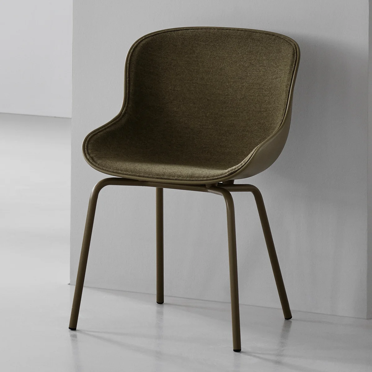 Norman Copenhagen stellt den Hyg Chair aus einem pulverbeschichteten Stahlgestell und einer Schale aus Polypropylen her. Die Polsterung ist mit einem Stoff des Herstellers Camira bezogen, welcher aus weicher Baumwolle und Flachs besteht.