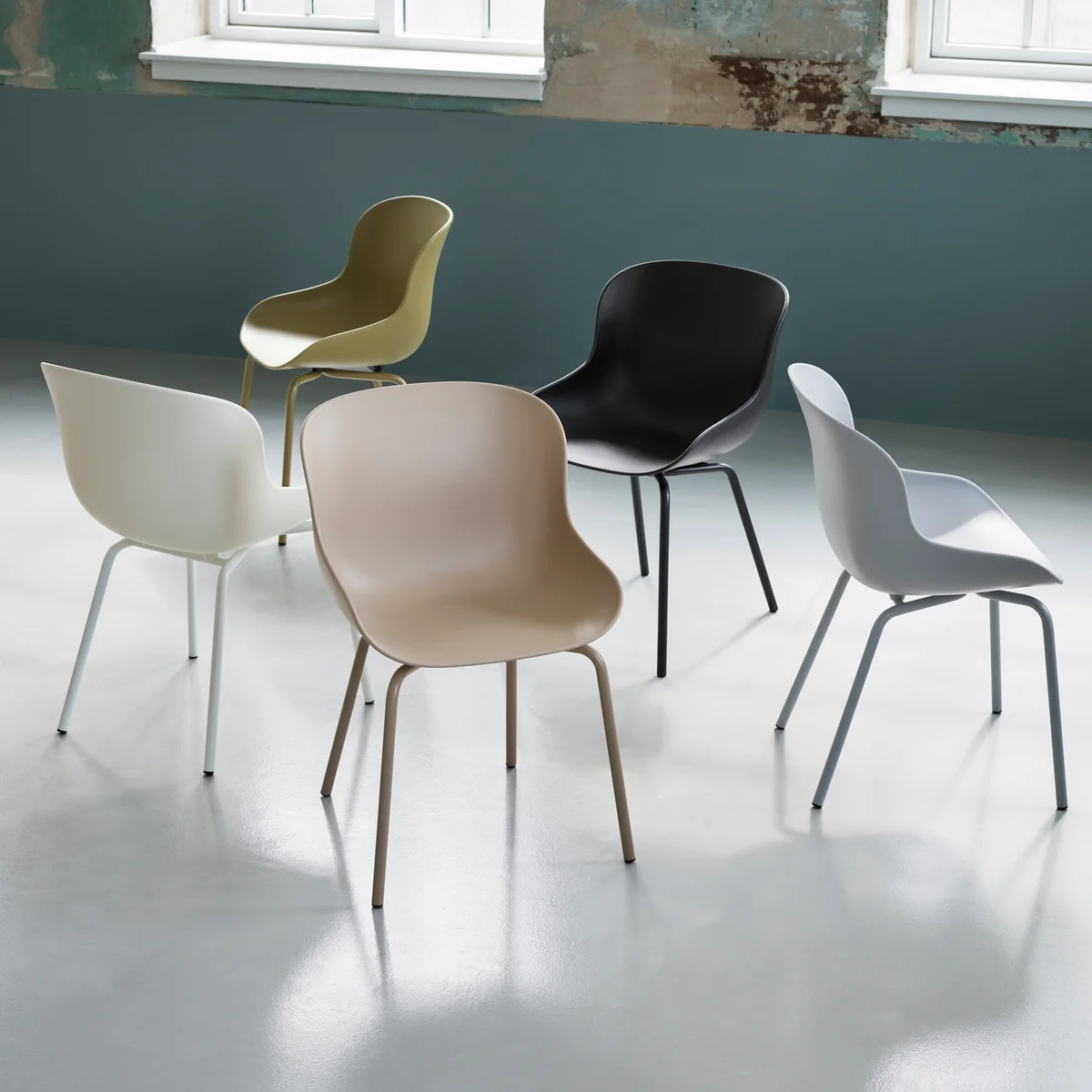 Der Stuhl besteht aus einem Vierbein-Gestell aus pulverbeschichtetem Stahl und einer Sitzschale aus Polypropylen. Beide Teile sind in derselben Farbe lackiert wodurch der Stuhl ein besonders ruhiges und einheitliches Aussehen erhält. An einem Esstisch oder einem Schreibtisch kommt der zeitlose Stuhl besonders gut zur Geltung. In verschiedenen Farben erhältlich fügt sich der Hyg Stuhl gut in verschiedene Ambiente ein.