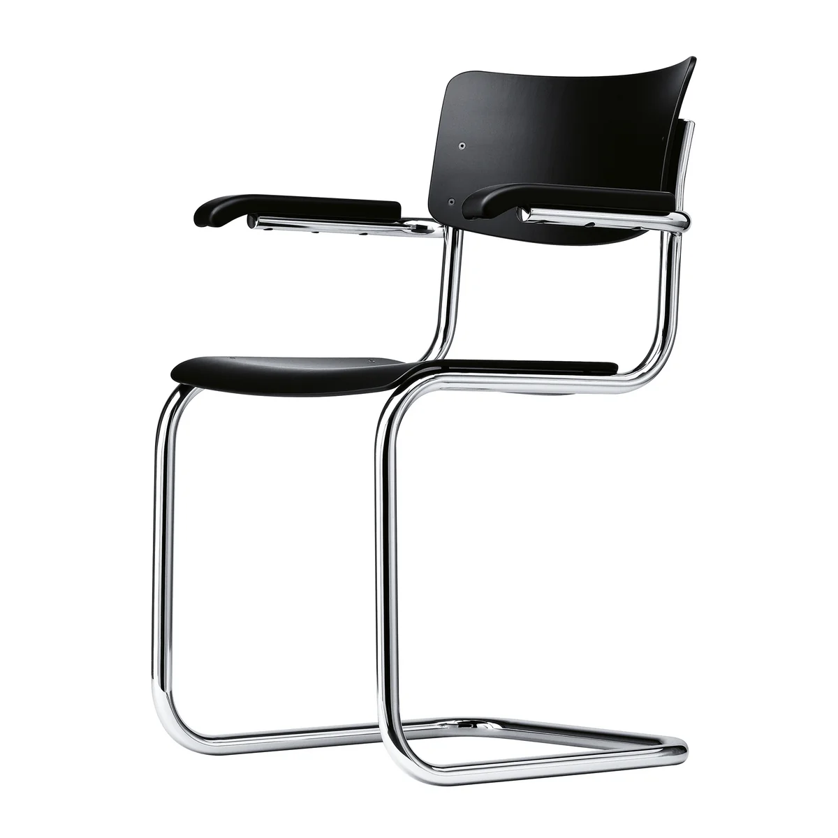 Der Stuhl aus Stahlrohr und Buchenholz wird durch die Armlehnen komplementiert und ist dabei so bequem, dass bei Sitz- und Rückenschale auf die Polsterung verzichtet werden kann. Das sanfte Schwingen des Stuhls macht ihn zu einer besonders bequemen Sitzgelegenheit im Geiste der Moderne.