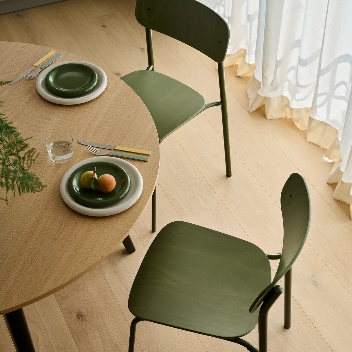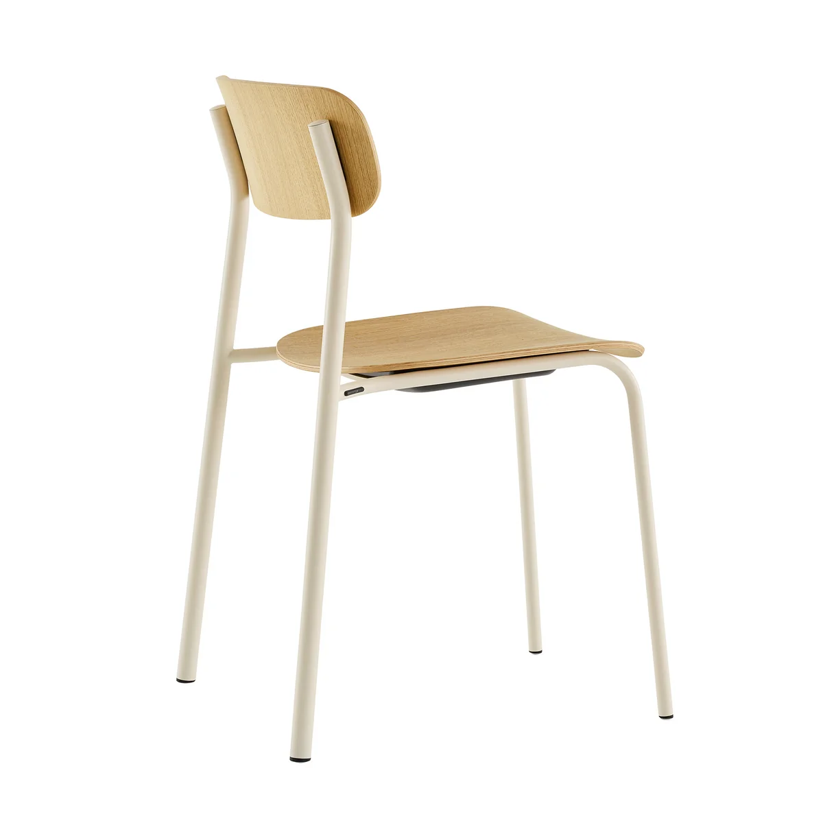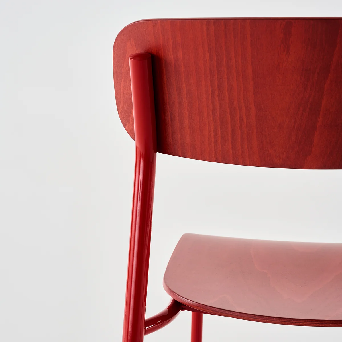 Der S 243 Stuhl kombiniert ein Stahlrohrgestell mit Formholz für Sitz und Rücken und zeigt eine minimalistische, dennoch formschöne Ästhetik. Entworfen von Frank Rettenbacher, zeichnet sich der Stuhl durch seine leichte, stapelbare Konstruktion aus, die optimal auf moderne Lebens- und Arbeitswelten abgestimmt ist. Die klare Bauweise unterscheidet zwischen den hinteren, stärkeren Beinen mit einem Durchmesser von 25 mm und den vorderen, schlankeren Beinen mit 18 mm, die sichtbar von der Vorderseite bis zur Verbindung mit den Hinterbeinen verlaufen und dem Stuhl eine besondere Leichtigkeit verleihen.