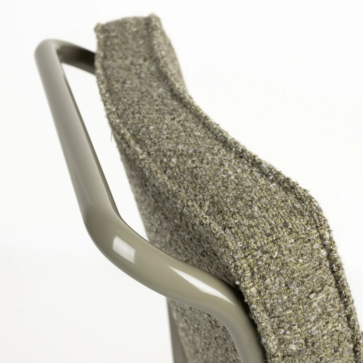 Die weiche Bouclé-Polsterung besteht zu 100 % aus recyceltem Polypropylen, das aus Produktionsresten von Windeln und Gesichtsmasken gewonnen wird. Der Stoff trägt das Global Recycled Standard (GRS)-Zertifikat, das eine transparente und verifizierte Herkunft der recycelten Materialien garantiert.