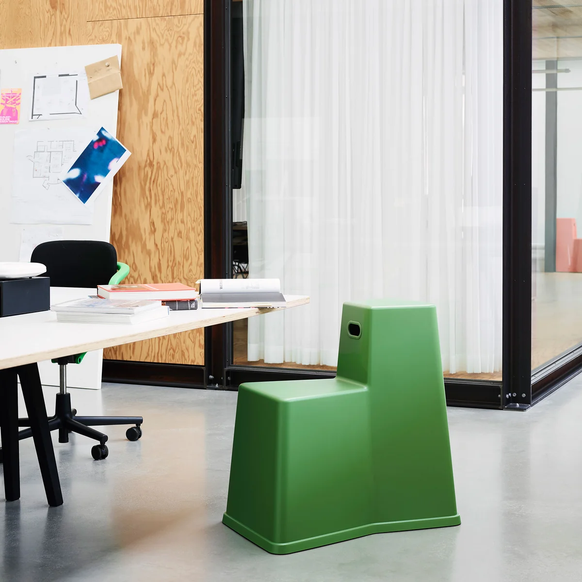 Der Stool-Tool von Vitra zeichnet sich durch sein stufenförmiges Design aus, das Tisch und Stuhl in einem cleveren Möbelstück vereint. Dank seiner zwei verschieden hohen Plattformen lädt der Stool-Tool dazu ein, genutzt zu werden und die möglichen Sitzpositionen zu testen. Der Gebrauch erfolgt dabei ganz intuitiv: Das höhere Podest lässt sich zum einen als komfortable Rückenlehne und zum anderen als kleine Arbeitsfläche oder Ablage nutzen.