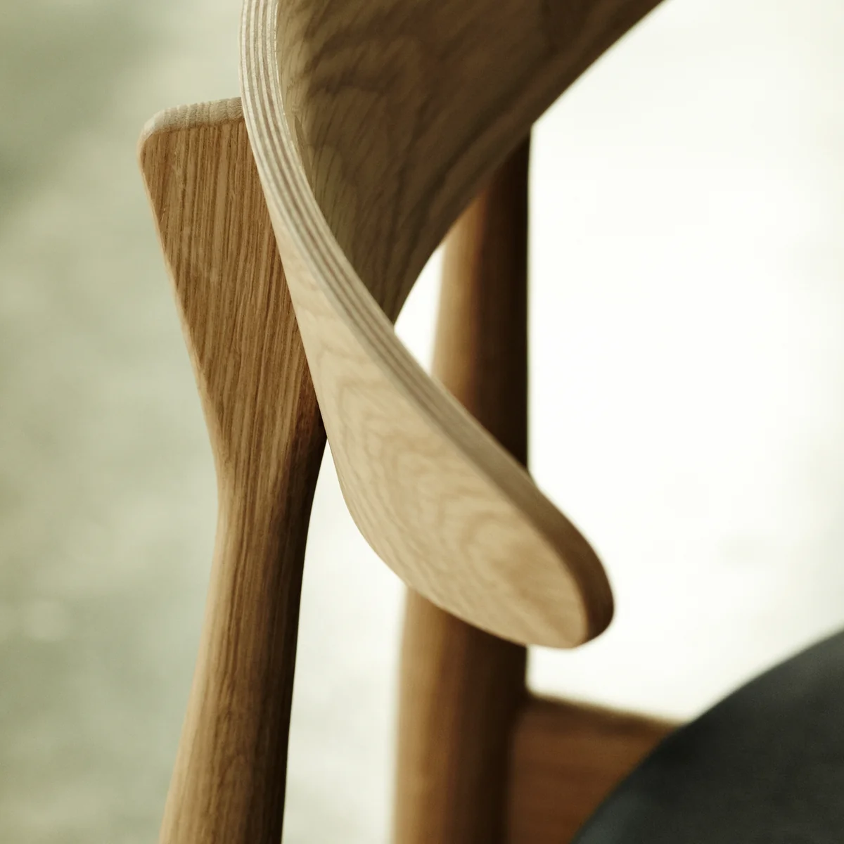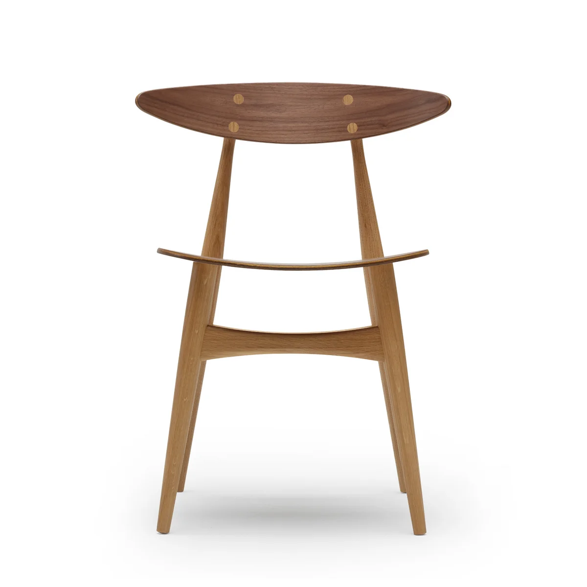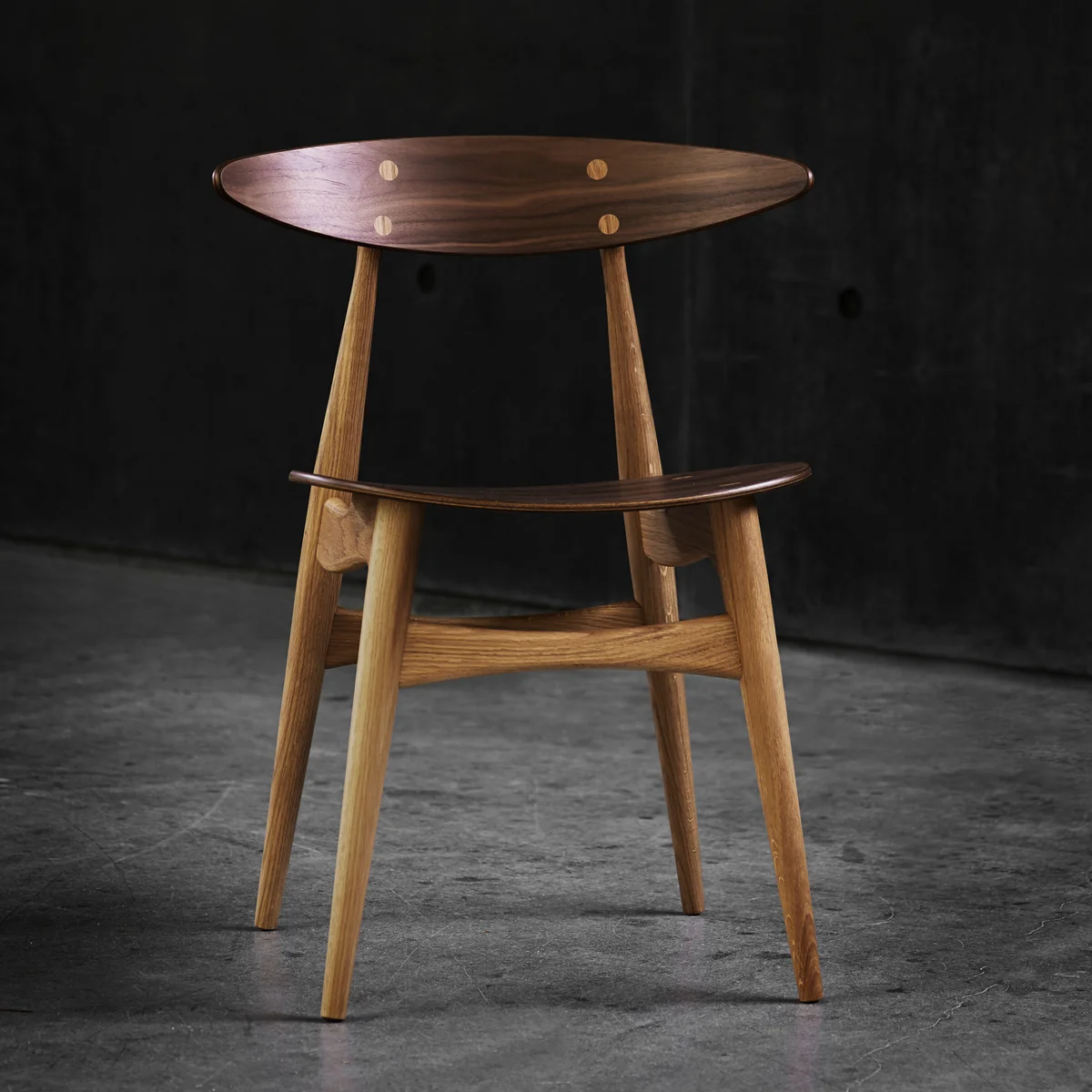 Die Verbindungen zwischen den Hinterbeinen und der Rückenlehne sind sichtbare, klassische Beispiele für Hans J. Wegners Liebe zu ehrlicher, auf solider Handwerkskunst basierender Gestaltung. Dabei sind die Knöpfe des Stuhlrückens immer in der gleichen Holzausführung wie der Stuhlrahmen gehalten. Ein verbindendes Element, das das massive Untergestell und den Sitz und die Rückenlehne aus Furnier nicht nur statisch, sondern auch optisch zusammenführt.