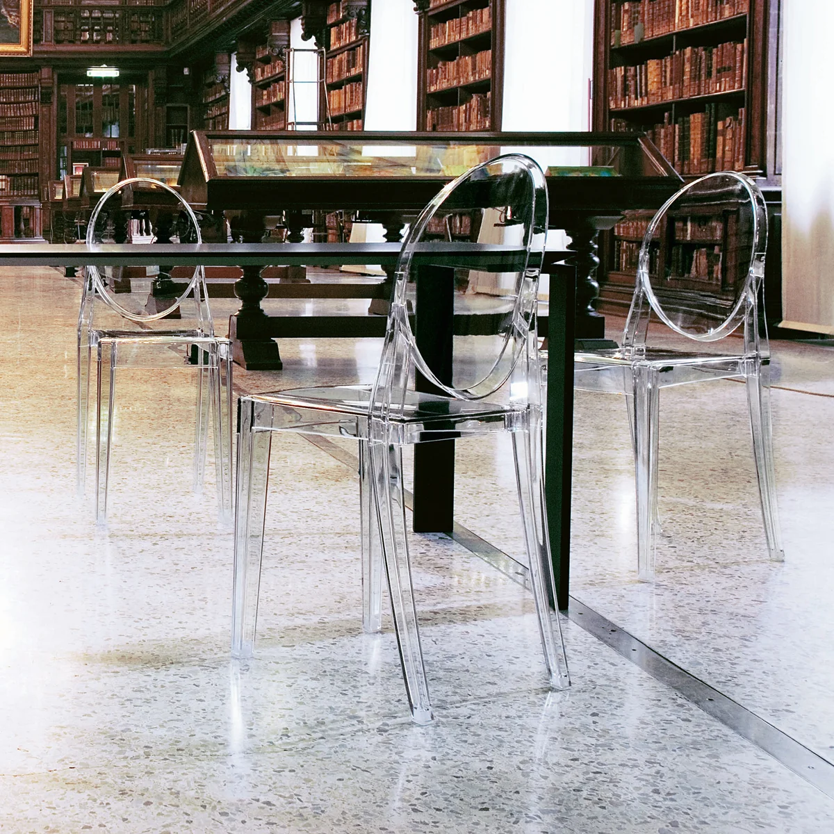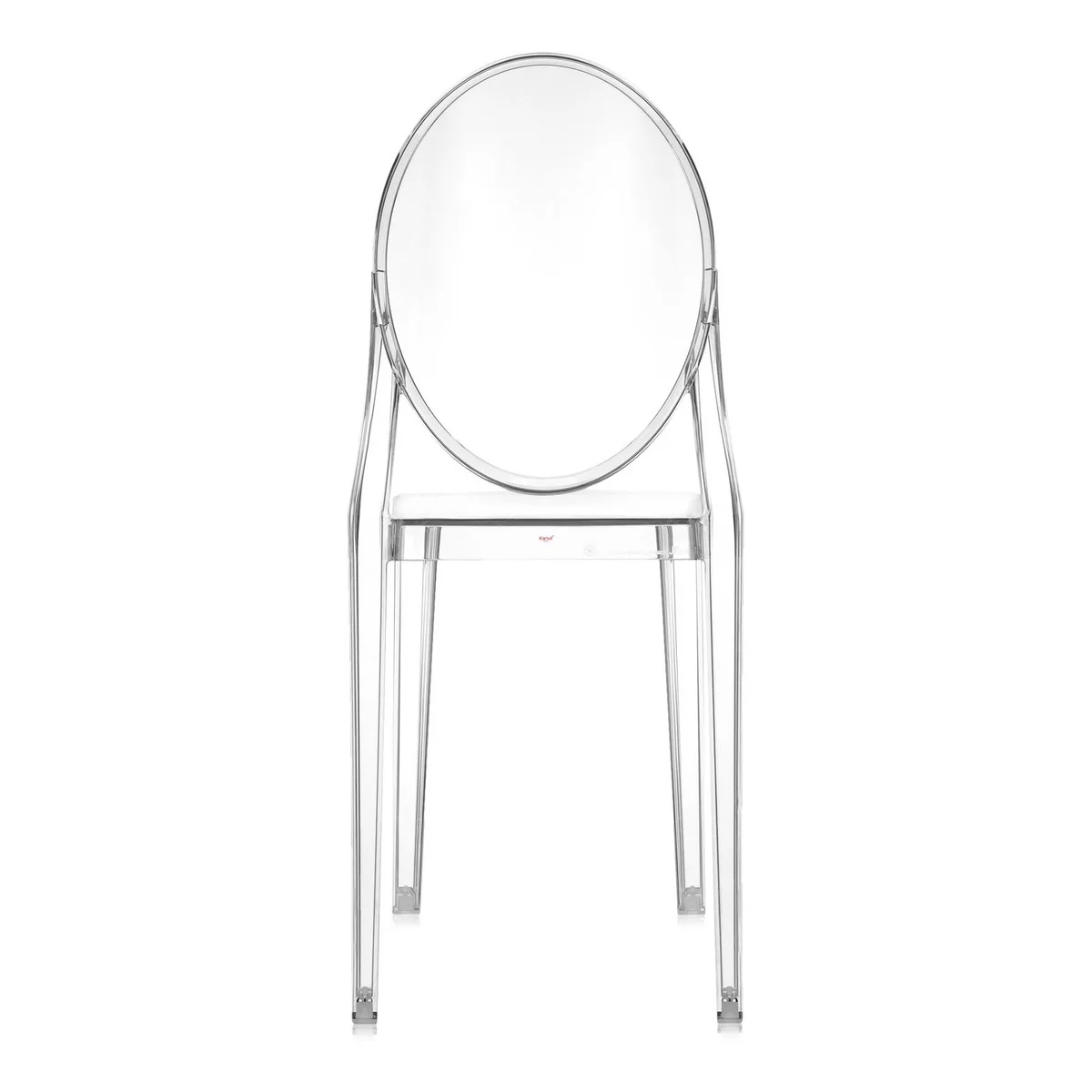 Der Victoria Ghost Stuhl von Philippe Starck für Kartell ist ein Stuhl in klassischer Form aus transparentem Polycarbonat - Kunststoff, wodurch der Suhl fast unsichtbar - wie ein Geist - zu schweben scheint.