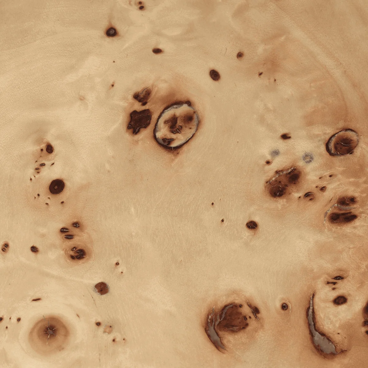 Die klare Linienführung des Tisches in Verbindung mit der natürlichen Unregelmäßigkeit des Burl-Holzes schafft ein minimalistisches und dennoch auffälliges Design. Der Tisch wird so zu einem kunstvollen Mittelpunkt in dem Wohnzimmer.