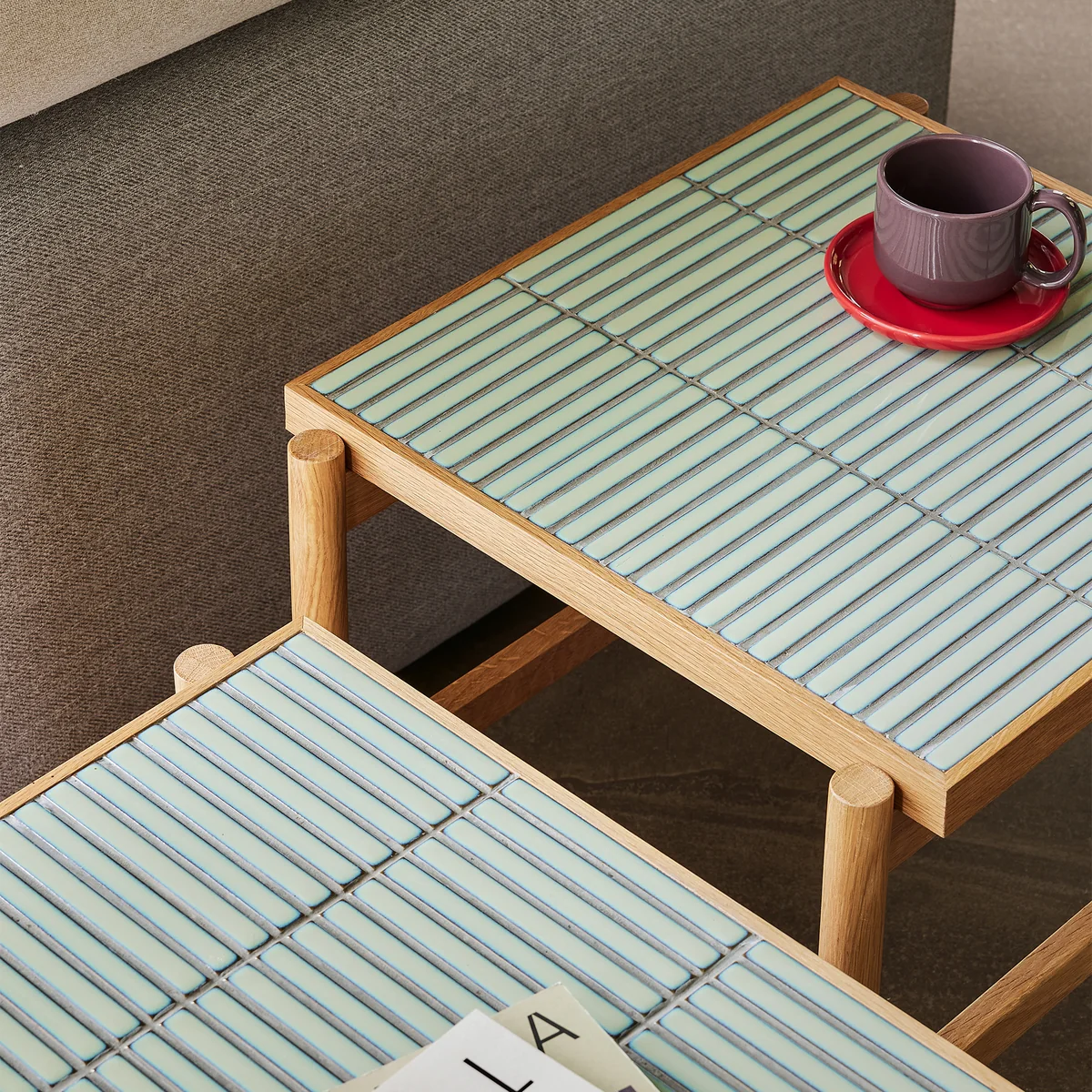 Der Tile Beistelltisch von Hübsch Interior verbindet verspieltes Design mit nachhaltigen Materialien. Die mintfarbene Tischplatte setzt einen frischen Akzent, während Eichenfurnier und Eichenholz für eine hochwertige, langlebige Basis sorgen. Die Fliesenoptik erinnert an nostalgische Kindermöbel, wird jedoch durch die elegante Materialkombination modern interpretiert. Ein vielseitiges Möbelstück, das jedem Raum Charakter und Stil verleiht.