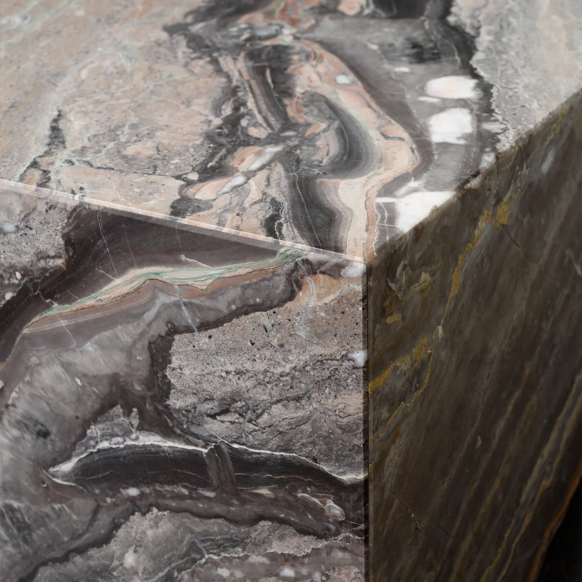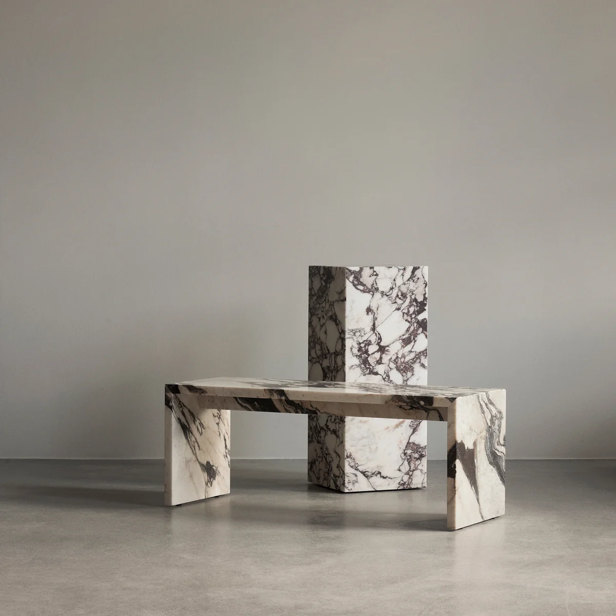 Das Design der Plinth-Serie zeichnet sich durch seine Sockel mit den scharfen Kanten und der Quader- bzw. Würfelform aus. Die Innenkonstruktion der Tische besteht aus Akazienholz und wird rundum von 1,5 cm dicken Marmorplatten umgeben.