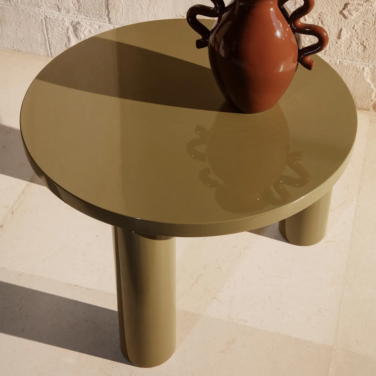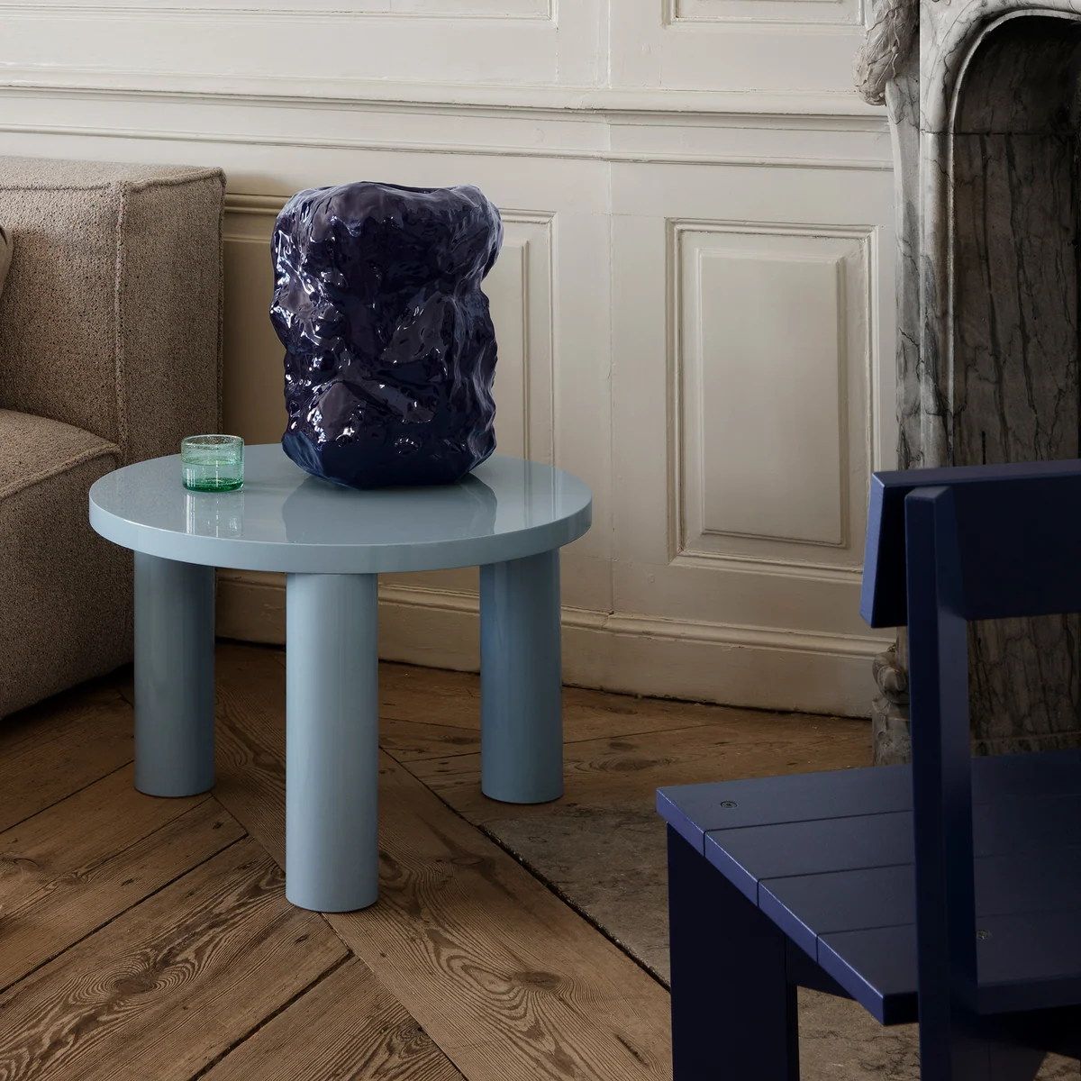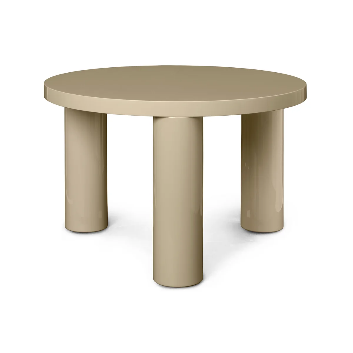 Der Post Couchtisch des dänischen Herstellers Ferm Living ist vom Brutalismus inspiriert und bietet mit seiner runden, großen Form überaus viel Platz. Der Couchtisch wird aus FSC® zertifiziertem Holz gefertigt und mit einem Hochglanz-Klavierlack versehen. Drei massive, zylindrische Beine tragen die robuste Tischplatte.
